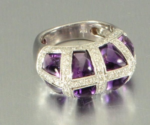 With appraisal: "One 18kt white gold amethyst and diamond ring. The ring contains eight (8) fancy cut amethyst cabochons measuring approx. 7.5 x 5.5 mm. The ring also contains one hundred-one (101) round brilliant cut diamonds with an approx. total weight of 1.00 ct., approx. Color G-H, approx. Clarity SI1. The ring weighs 10.0 grams. Approximate Appraised Value: $2,795.00".