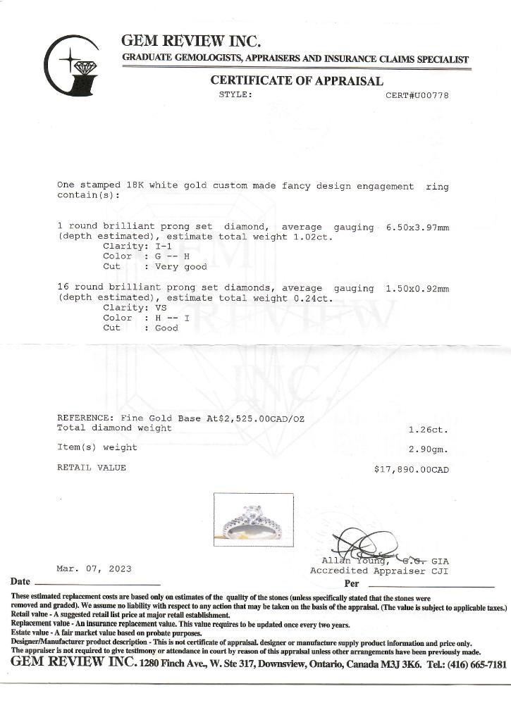 18kt White Gold Custom Made Fancy Design Diamond Solitaire Ring -1.26ct. Appraisal:$17,890.00