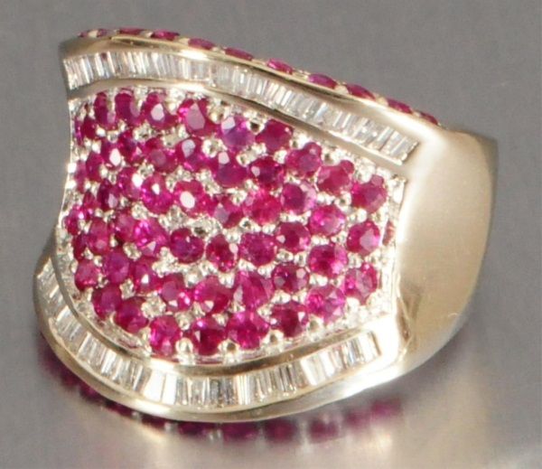With Appraisal: "One 18kt white gold ruby and diamond ring. The ring contains eighty (80) round cut rubies, each measuring approx. 1.8mm. The ring also contains fifty-six (56) tapered baguette diamonds with an approx. total weight of 0.56 ct., approx. Color G-H, approx. Clarity VS2-SI1. The ring weighs 10.5 grams. Approx. Appraised Value: $3,995.00".