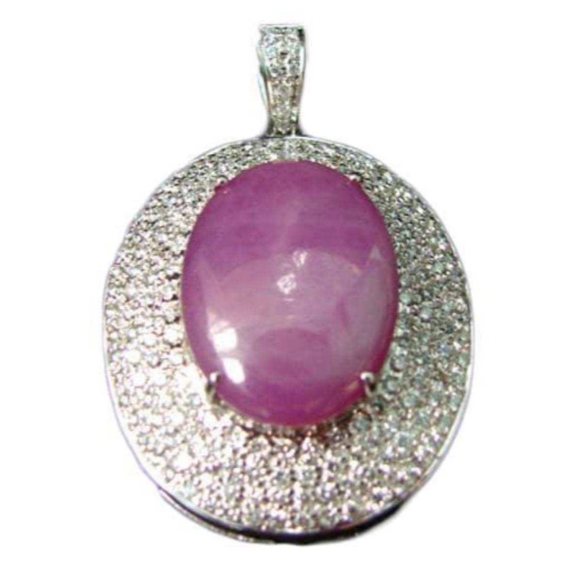 An 18kt white gold, star ruby & diamond pendant, containing one oval star ruby weighing approximately 20.39 carats &181 round brilliant diamonds weighing approximately 1.58 carats. 1 5/8" L with bail, 1 1/16" W.