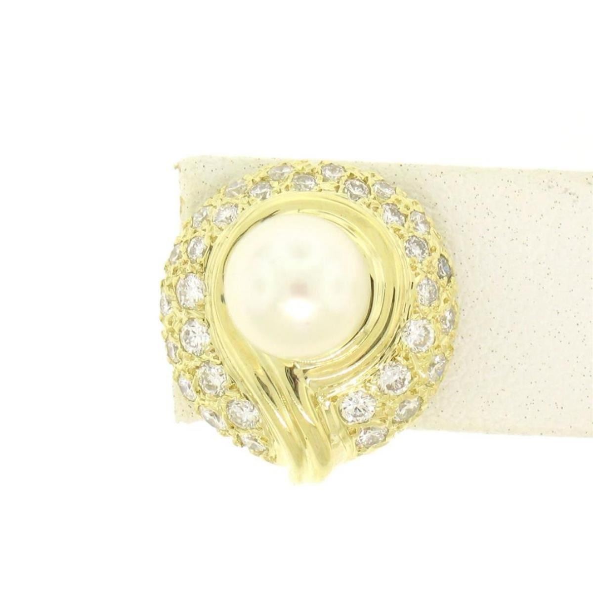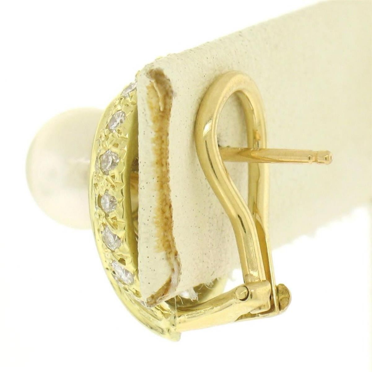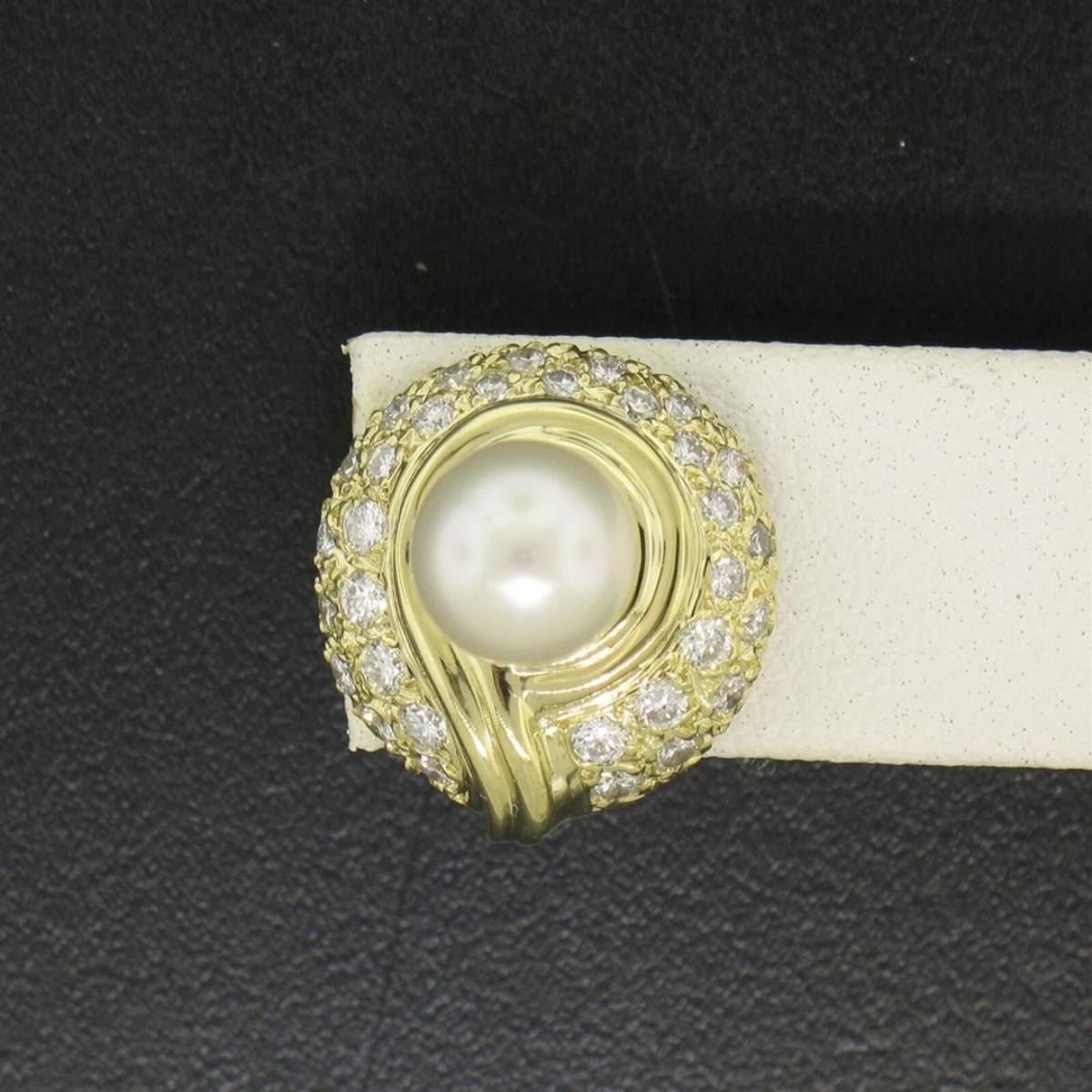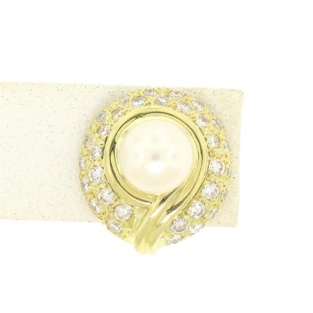 A pair of 18kt yellow gold earrings featuring approximately 7.25mm round cultured pearls surrounded by 1.25ctw of pave set round brilliant diamonds (E/F - VVS2/VS1). The earrings measure approximately 15.45mm in diameter and weigh a total of 9.60 grams.