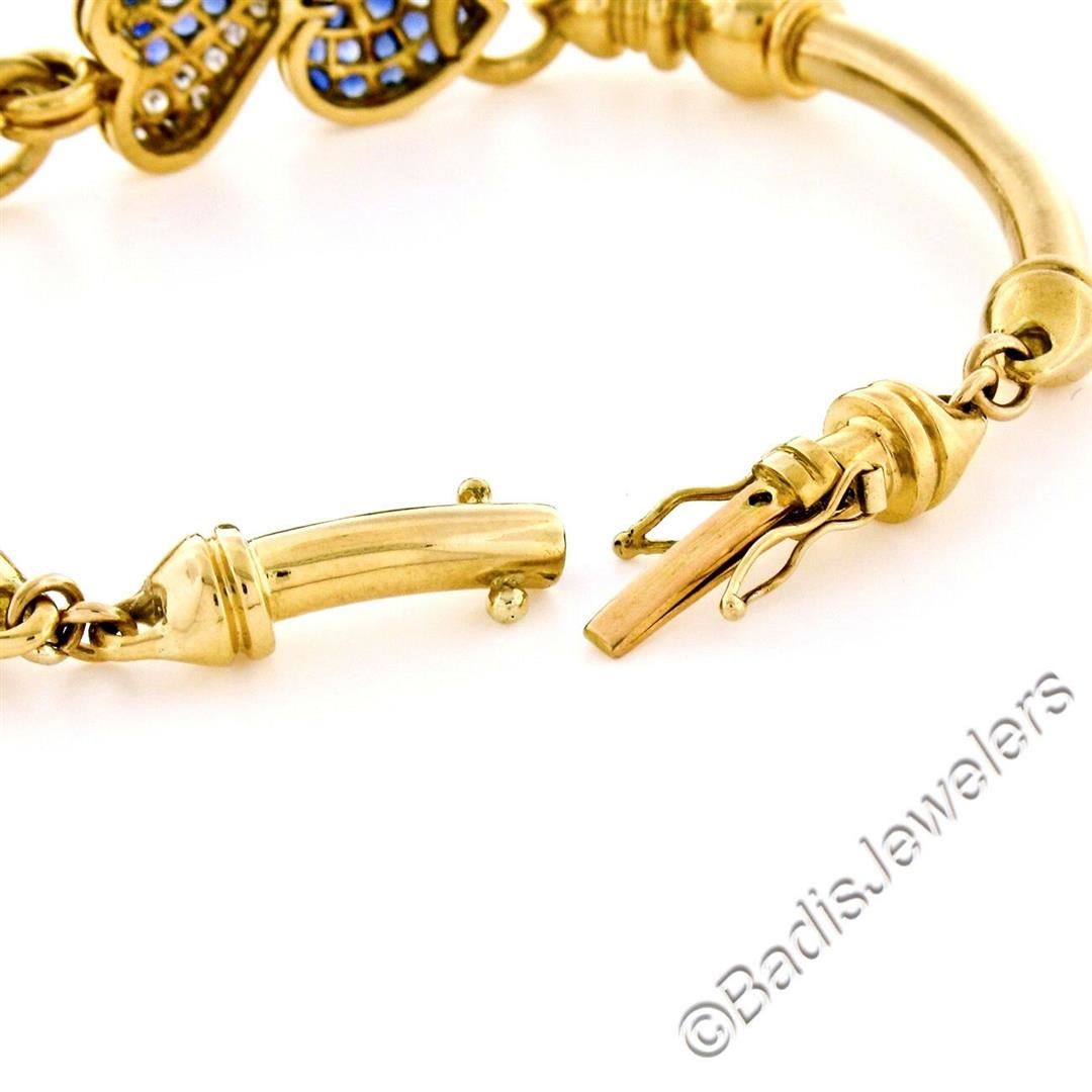 An 18kt yellow gold dual heart bracelet with 0.50ctw of round diamonds (F/G - VS1/VS2) and 1.08ctw of round sapphires. It weighs a total of 25.22 grams, measures 12.65mm wide, and measures 6.5 inches in length.