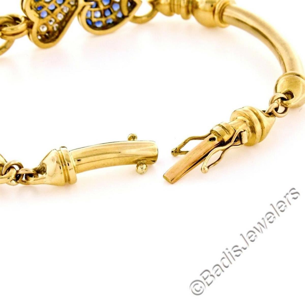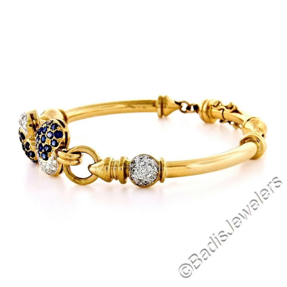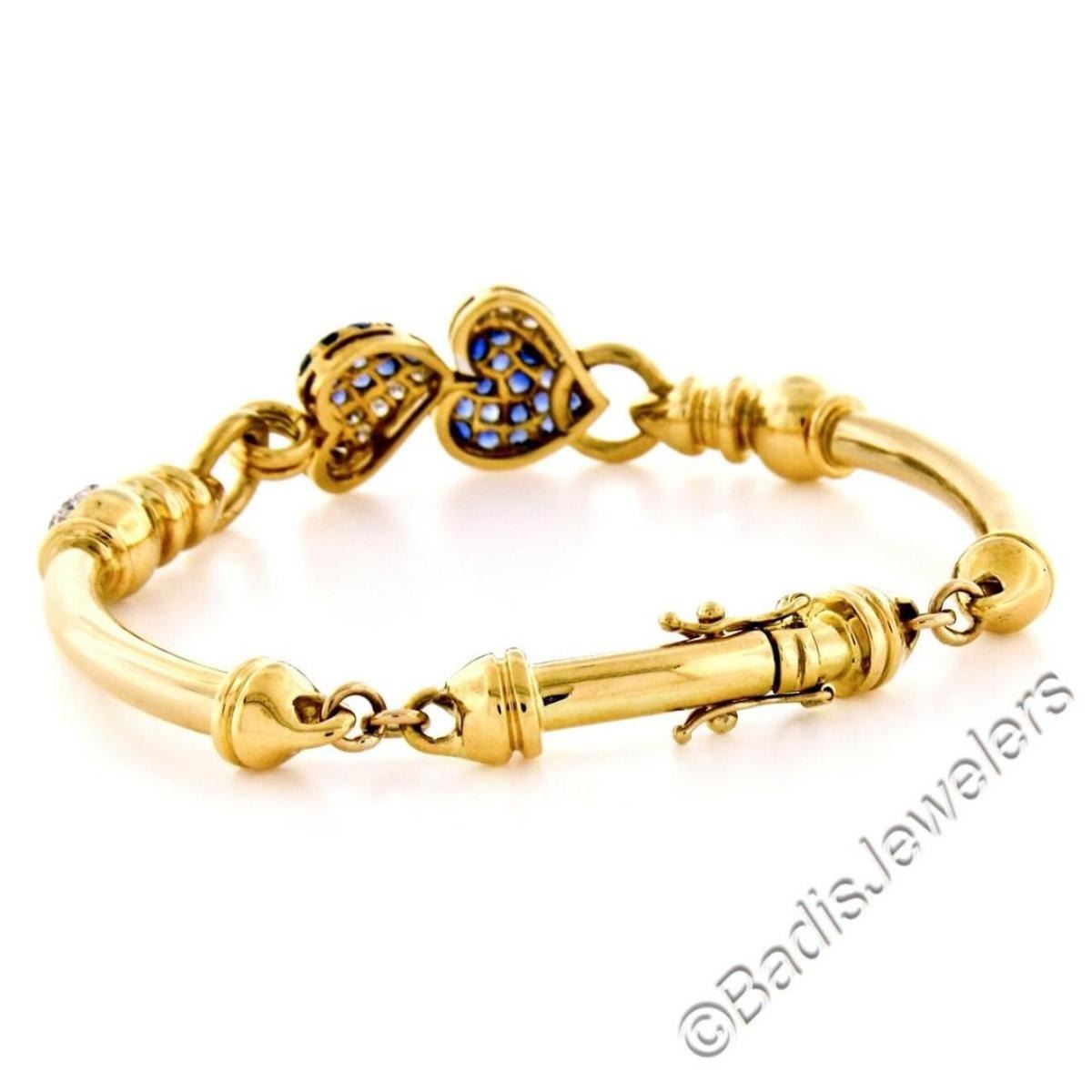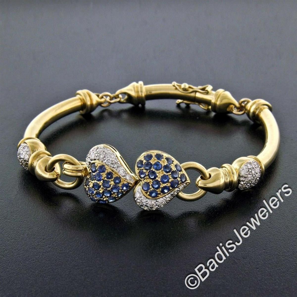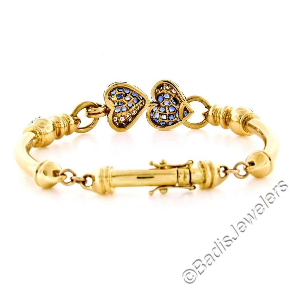 An 18kt yellow gold dual heart bracelet with 0.50 ctw of round diamonds (F/G - VS1/VS2) and 1.08ctw of round sapphires. It weighs a total of 25.22 grams, measures 12.65mm wide, and measures 6.5 inches in length.