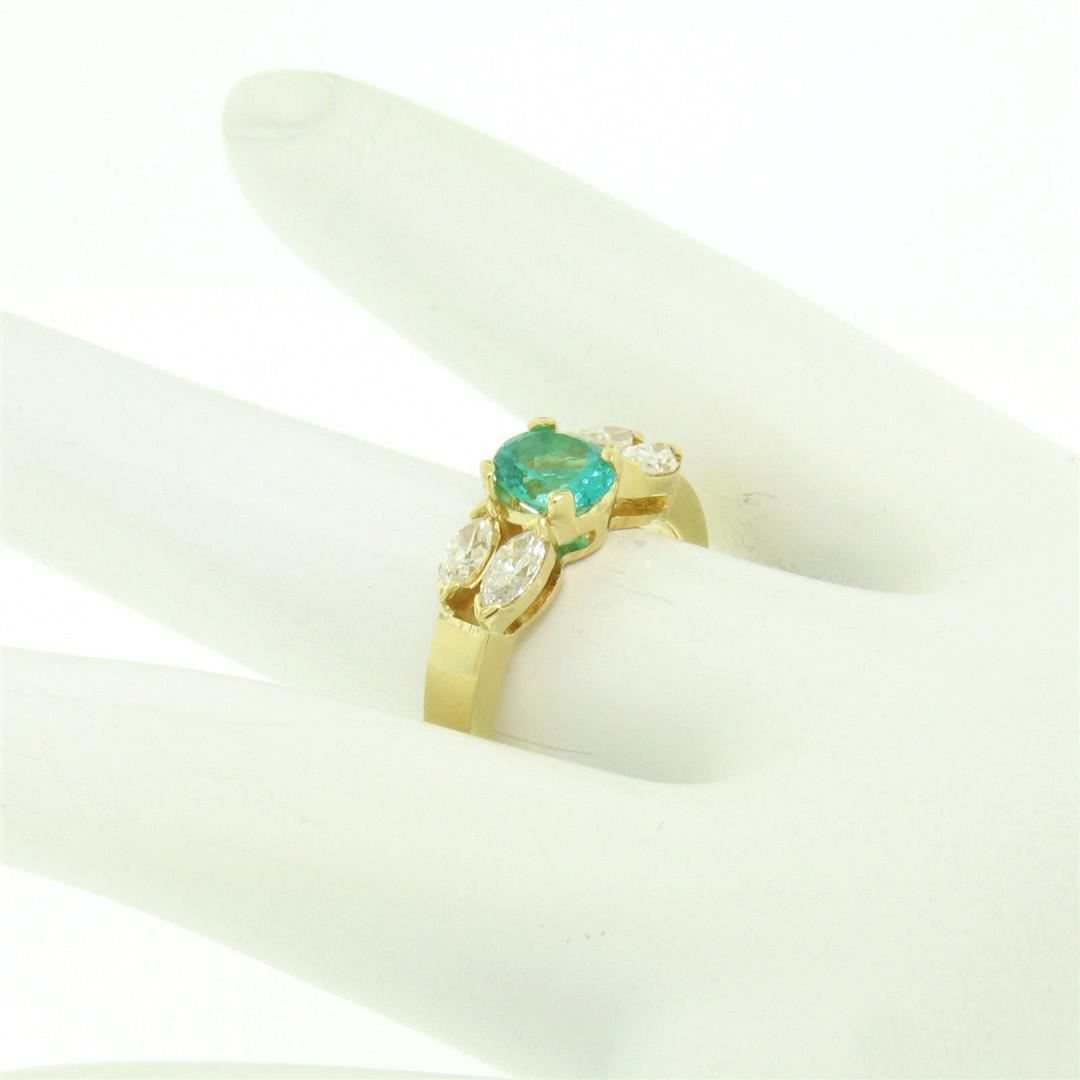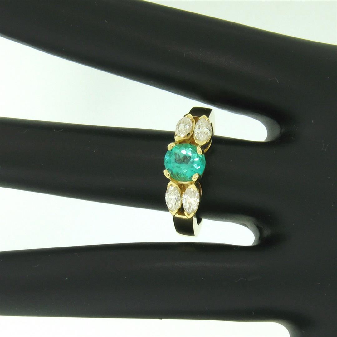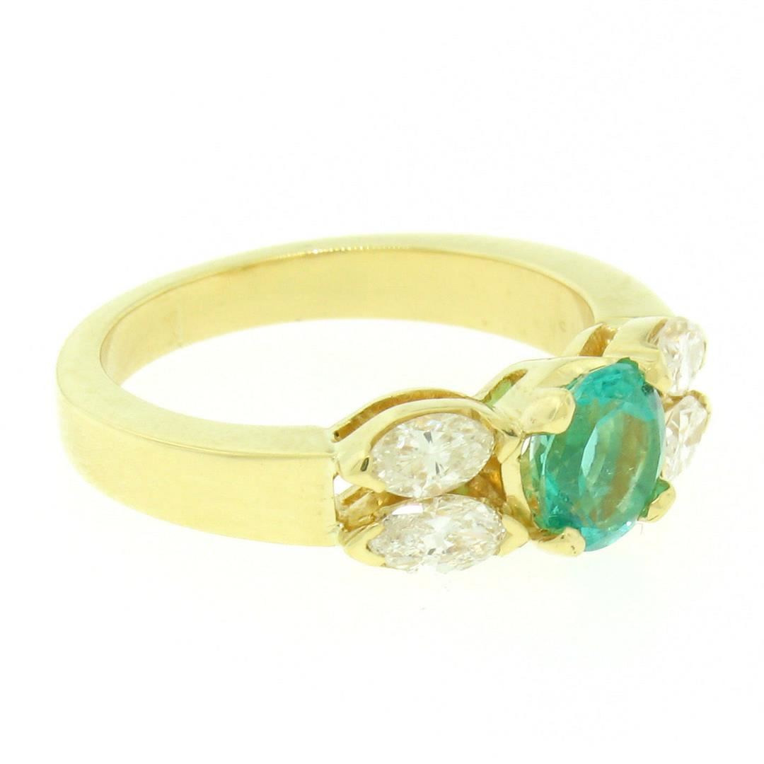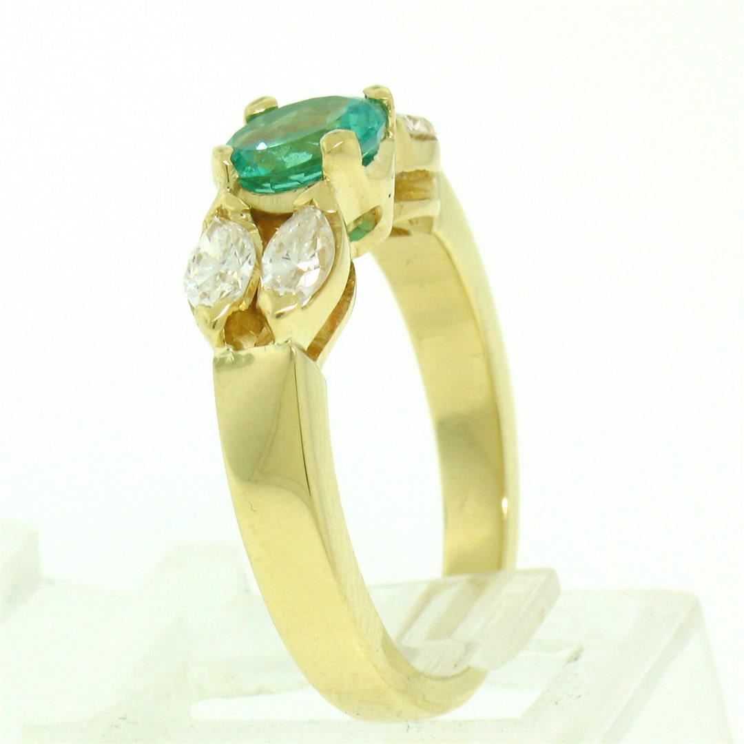 An 18kt yellow gold ring with a 1.09ct round emerald and 0.64ctw of marquise diamonds (H/I - VS1/VS2). The ring is size 6.0, weighs a total of 5.88 grams, and measures 6.17mm wide.