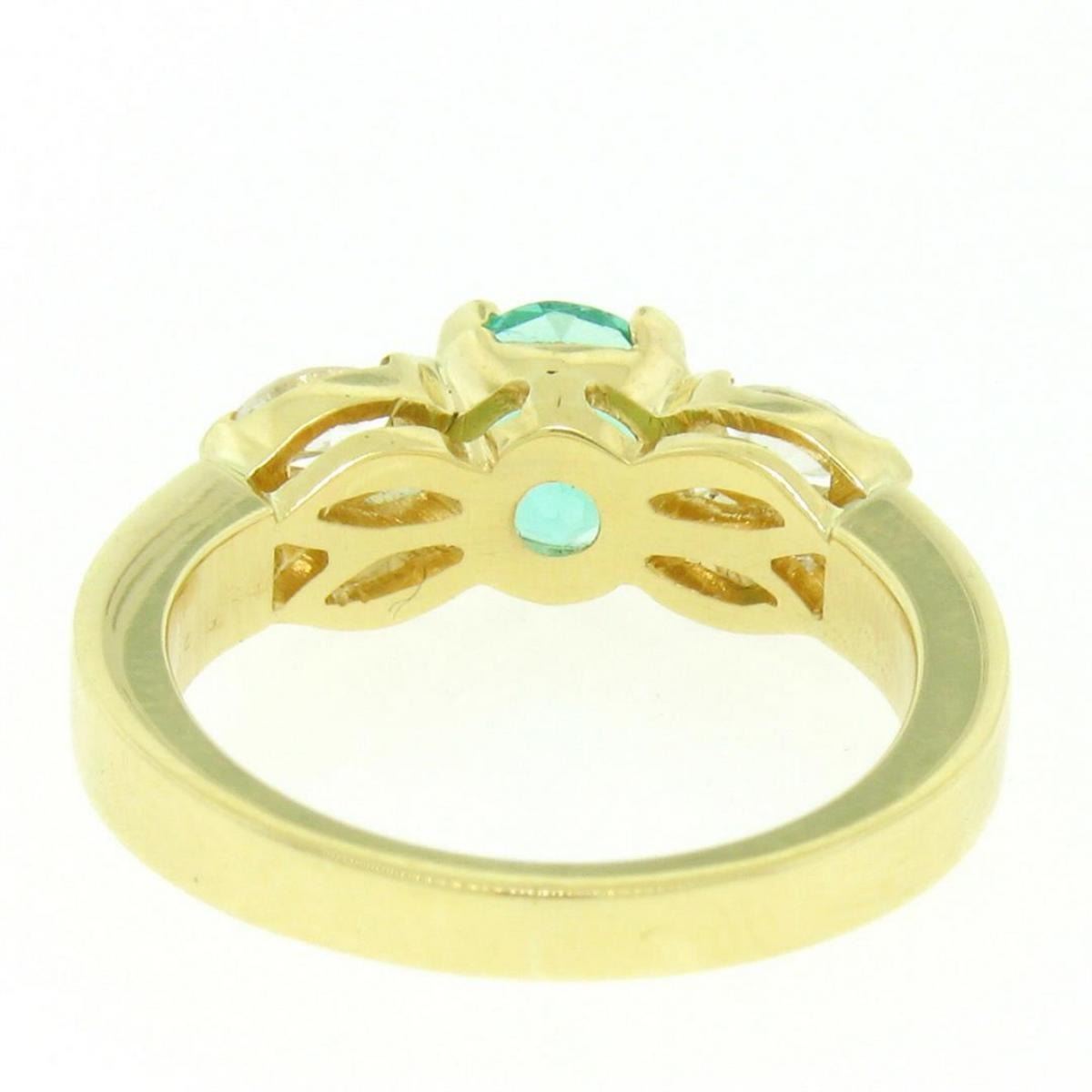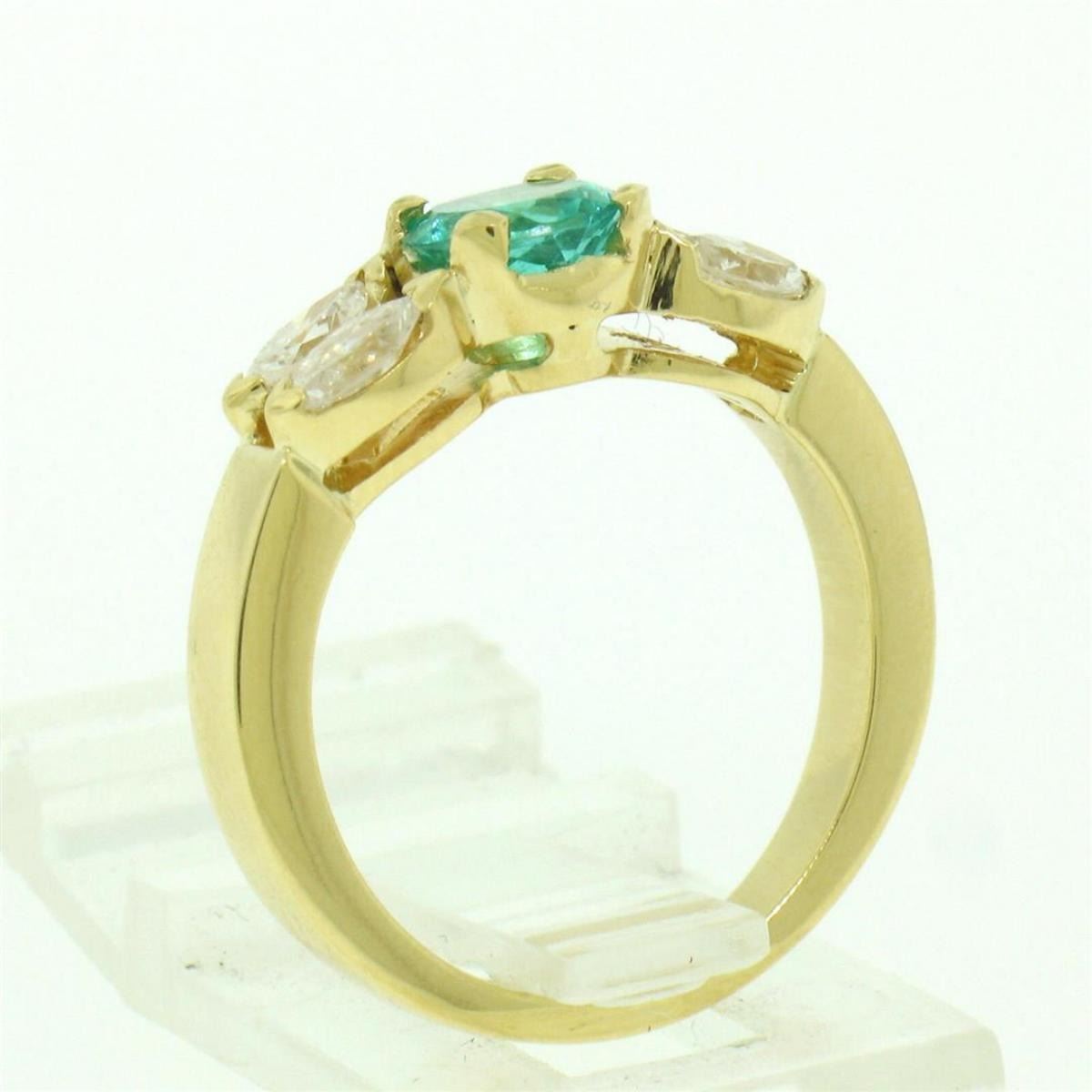 An 18kt yellow gold ring with a 1.09ct round emerald and 0.64ctw of marquise diamonds (H/I - VS1/VS2). The ring is size 6.0, weighs a total of 5.88 grams, and measures 6.17mm wide.