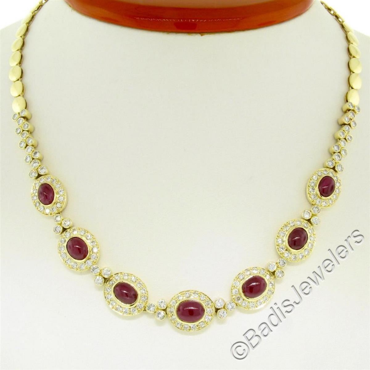 A like new 18kt yellow gold collar necklace bezel set with 9.25ctw of oval cabochon cut rubies and accented with 5.24ctw of round diamonds (F/G - VS1/VS2). It weighs a total of 36.62 grams, measures 11.60mm wide at its center, and measures 16 inches long.