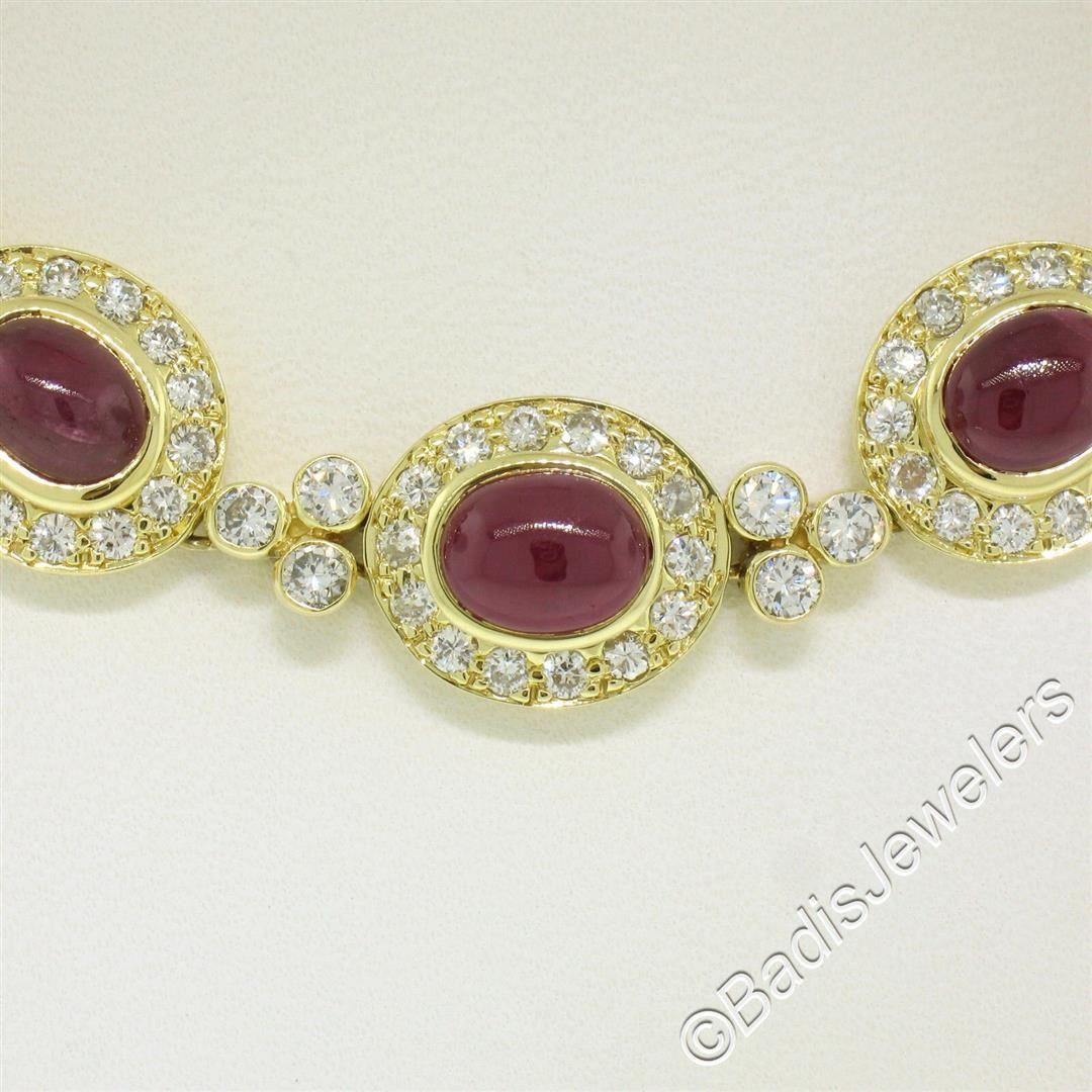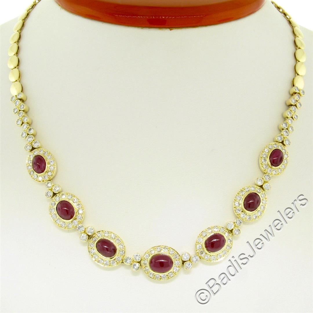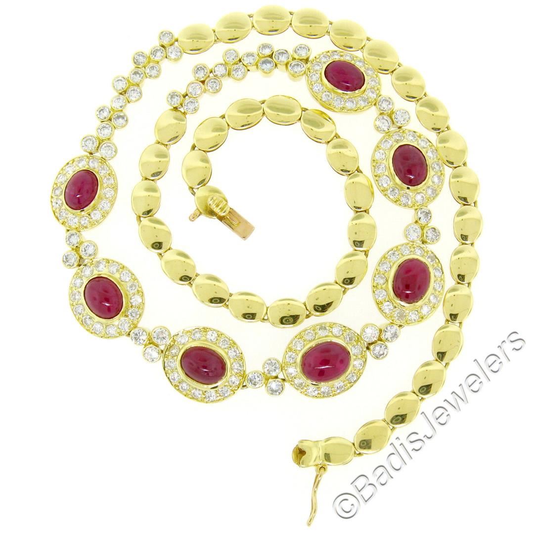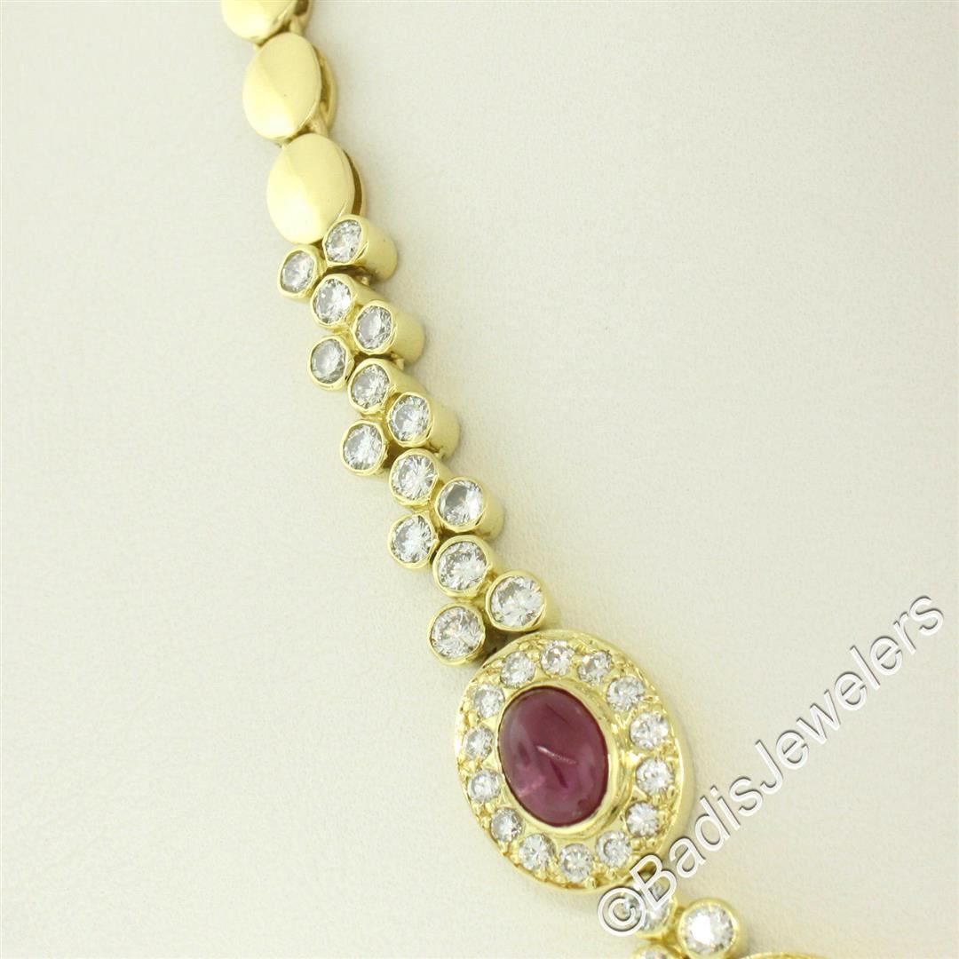 A like new 18kt yellow gold collar necklace bezel set with 9.25ctw of oval cabochon cut rubies and accented with 5.24ctw of round diamonds (F/G - VS1/VS2). It weighs a total of 36.62 grams, measures 11.60mm wide at its center, and measures 16 inches long.
