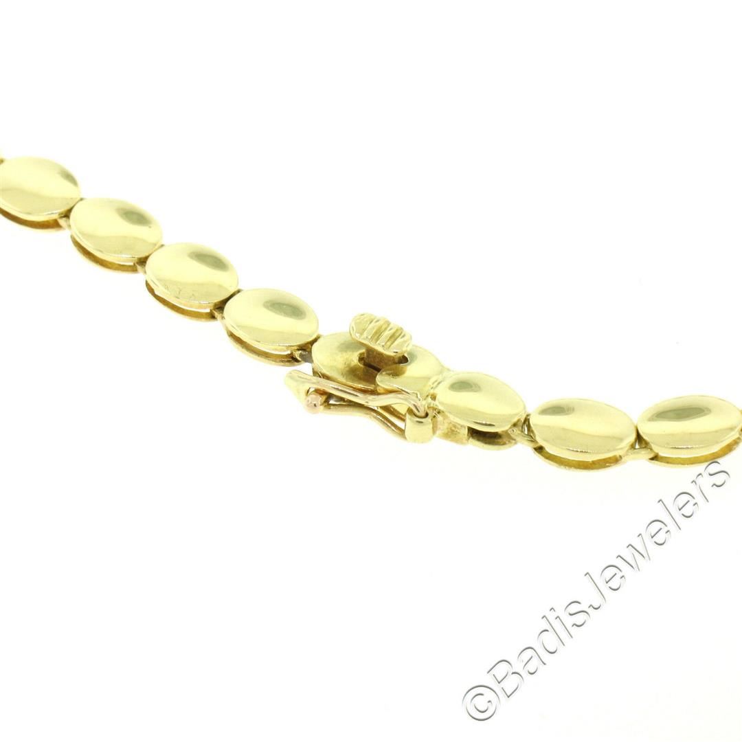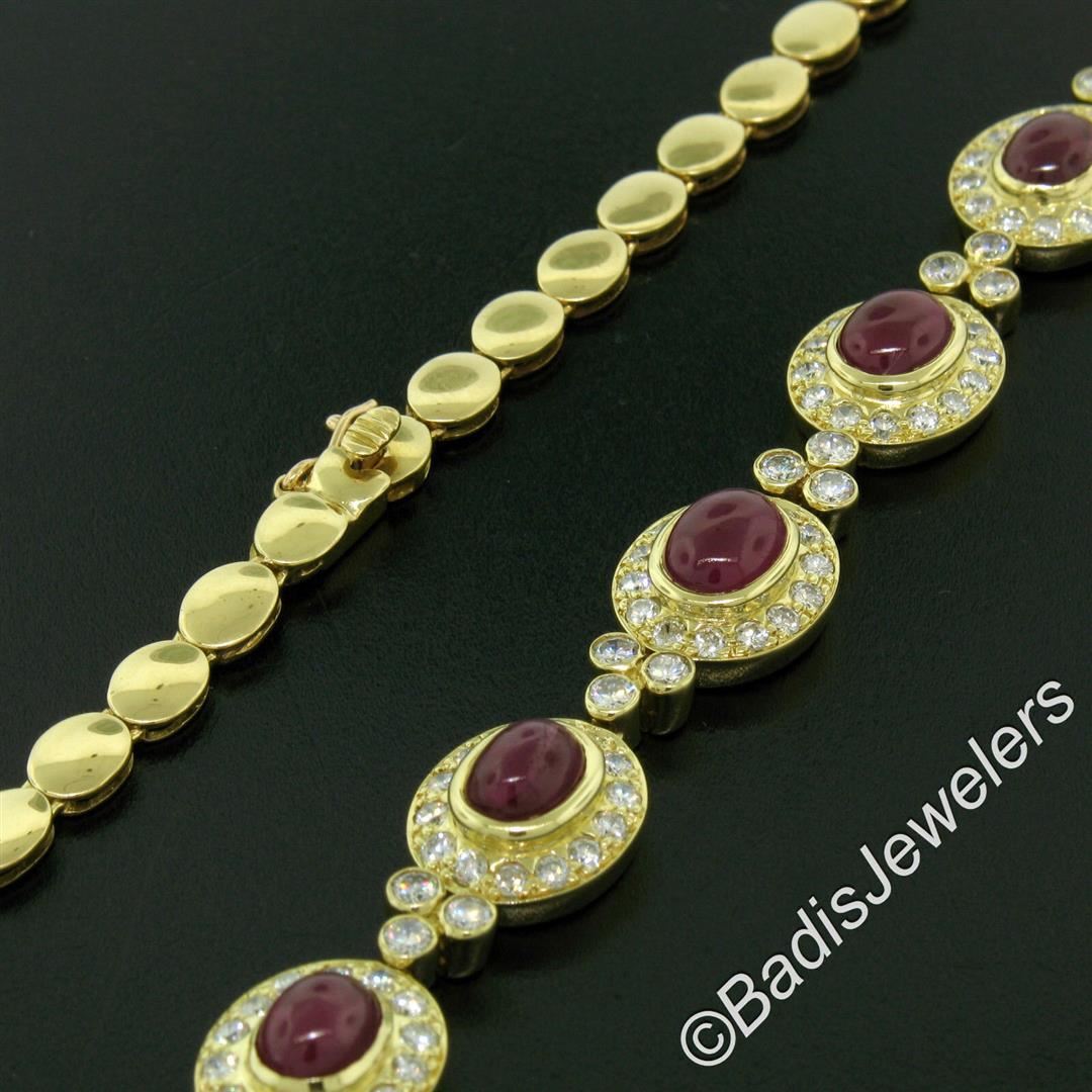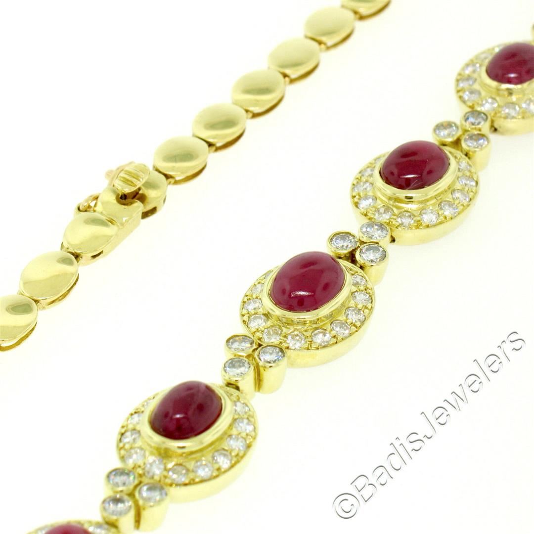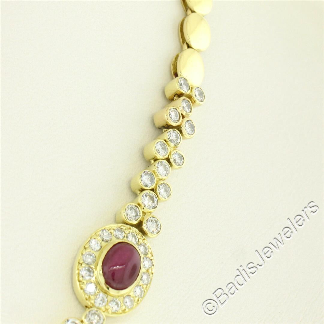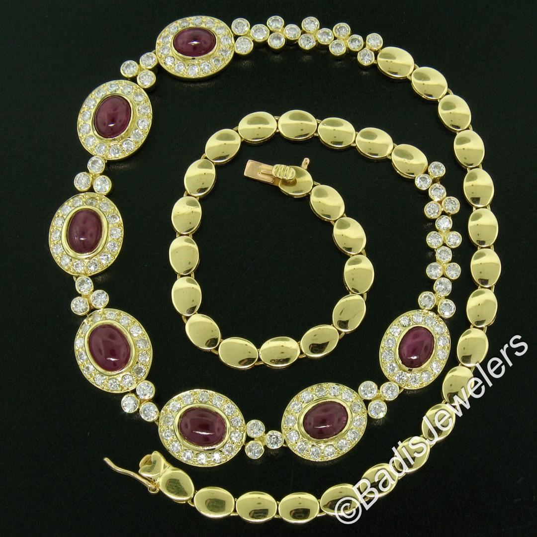 A like new 18kt yellow gold collar necklace bezel set with 9.25ctw of oval cabochon cut rubies and accented with 5.24ctw of round diamonds (F/G - VS1/VS2). It weighs a total of 36.62 grams, measures 11.60mm wide at its center, and measures 16 inches long.
