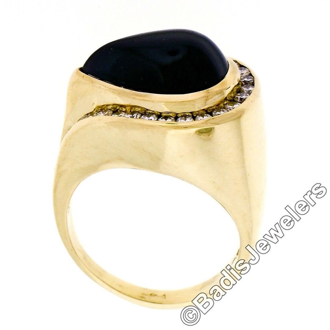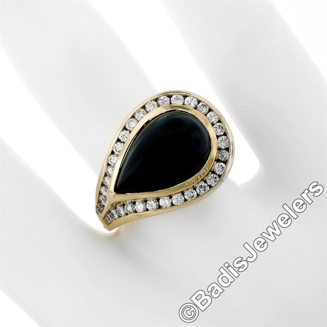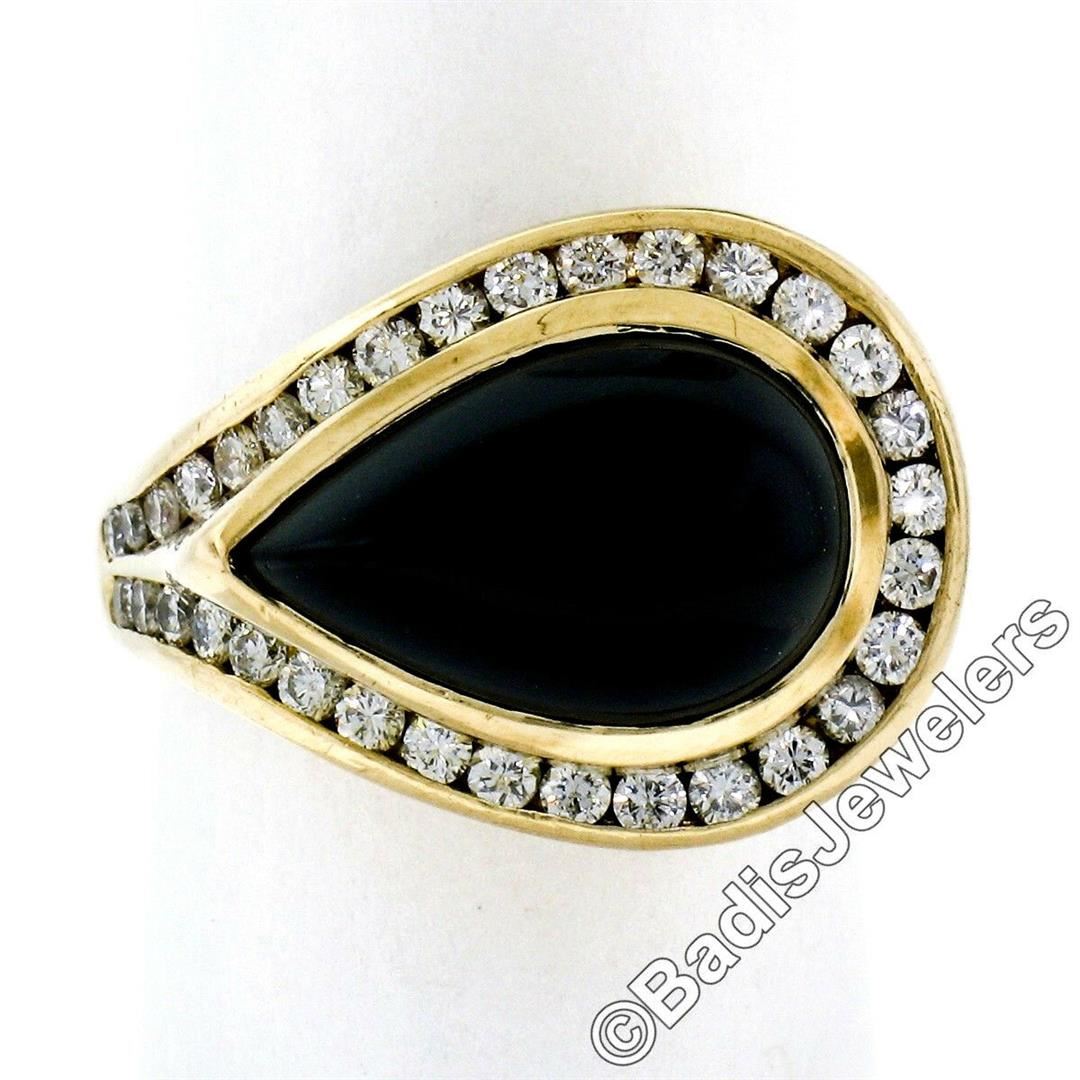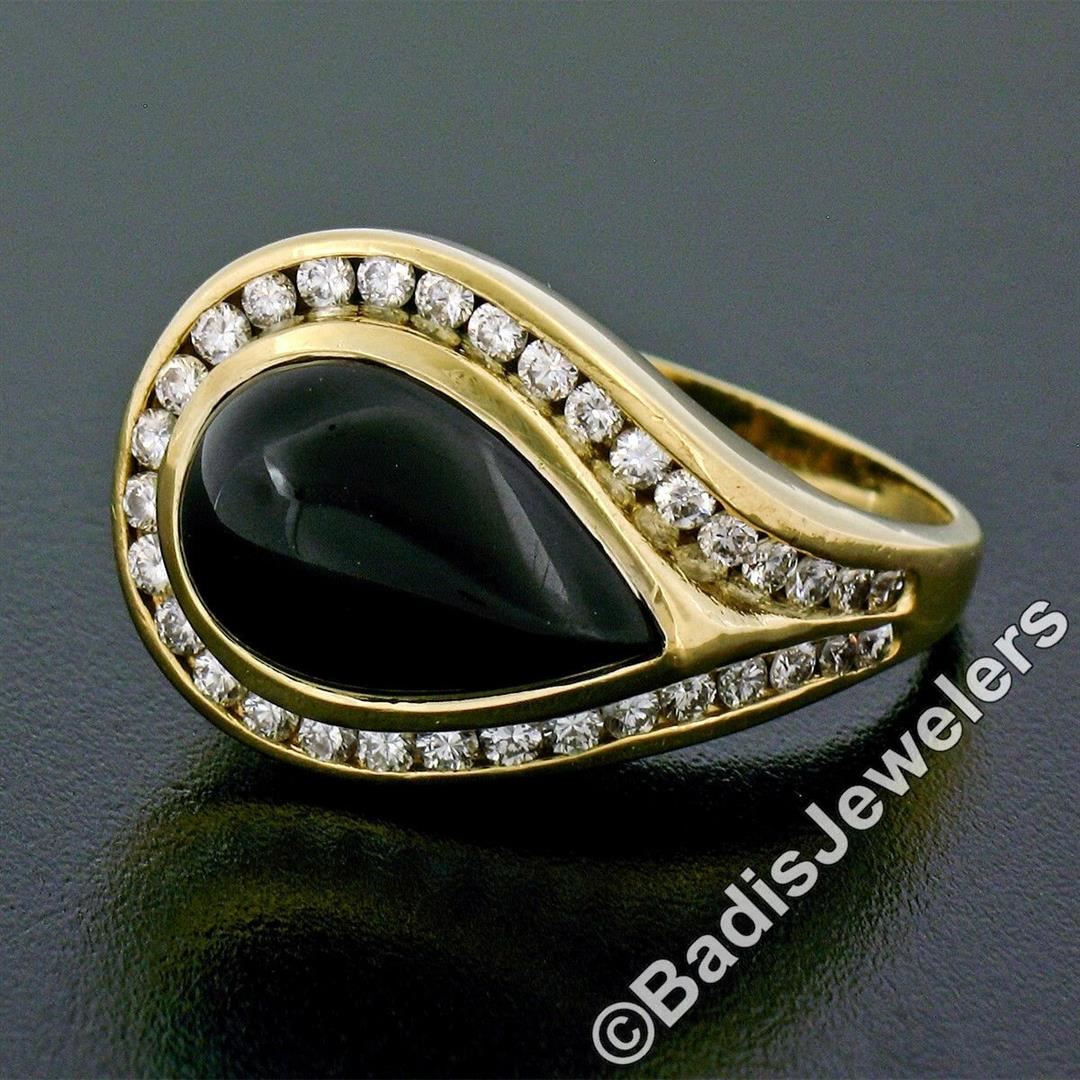 An 18kt yellow gold eye motif ring featuring a 13.70x8.75mm pear cabochon cut black onyx bezel set within a 0.82ctw channel set round brilliant diamond (F/G - VS1/VS2) frame. The ring is size 6.0, weighs a total of 12.11 grams, and measures 14.7mm wide.