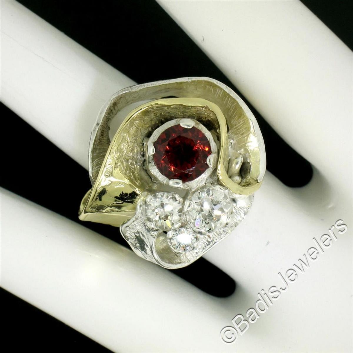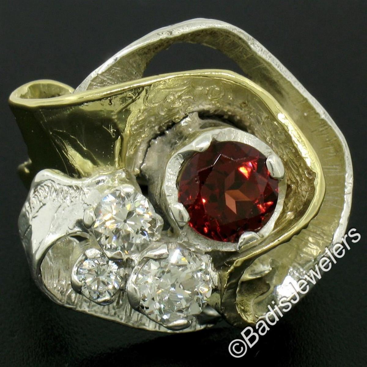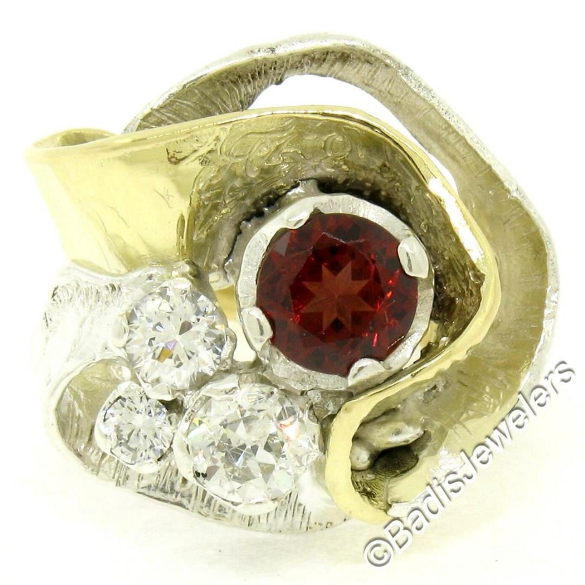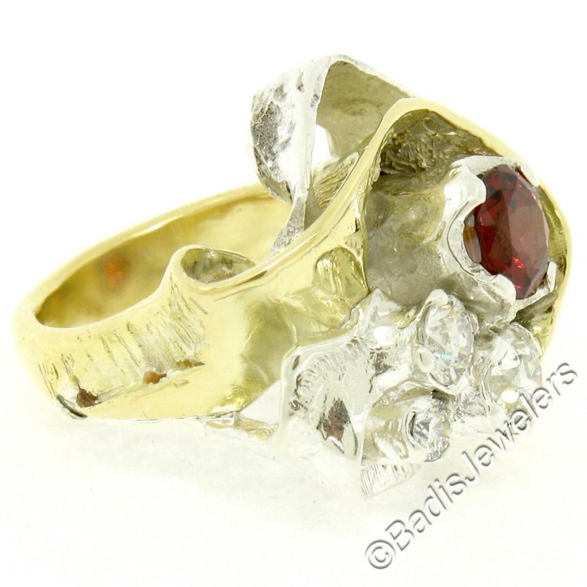A large 18kt yellow gold and sterling silver cocktail ring with a 1.60ct round garnet accented by 1.13ctw of round diamonds (F/G - VS2/SI1). The ring is size 5.5, weighs a total of 18.76 grams, and measures 22.5mm wide.