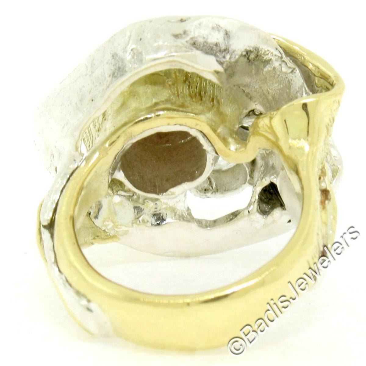 A large 18kt yellow gold and sterling silver cocktail ring with a 1.60 ct round garnet accented by 1.13ctw of round diamonds (F/G - VS2/SI1). The ring is size 5.5, weighs a total of 18.76 grams, and measures 22.5mm wide.