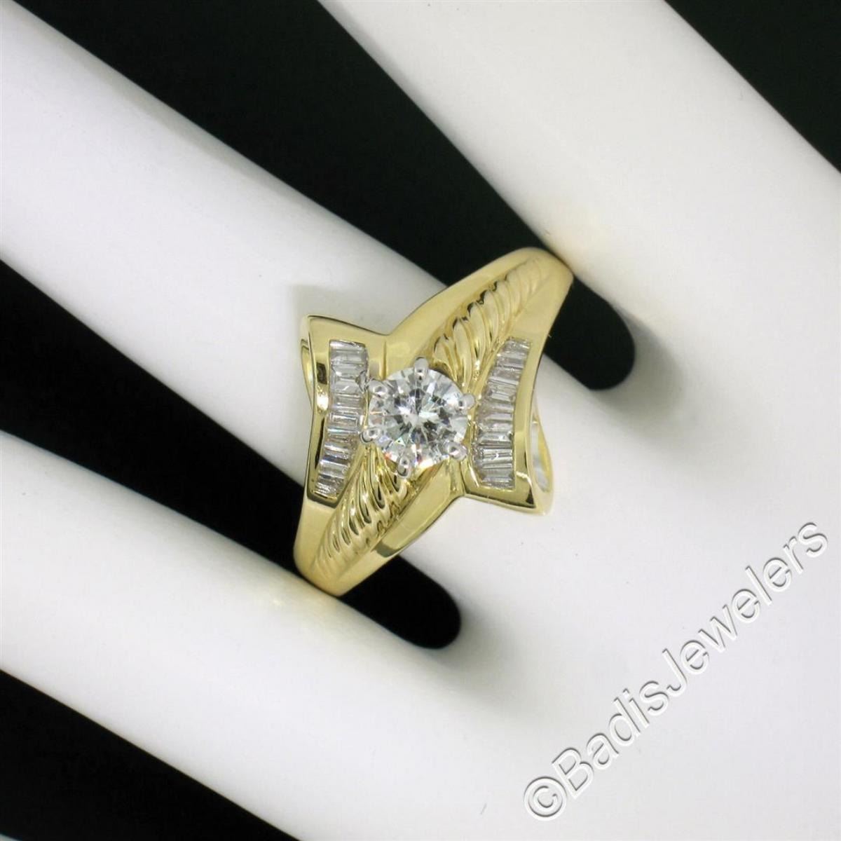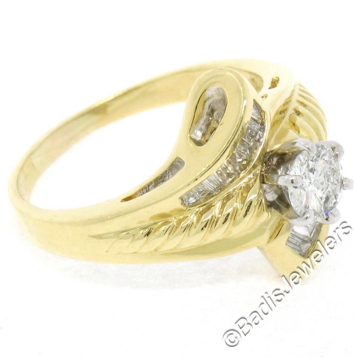 An 18kt yellow and white gold diamond bypass ring with a 0.53ct round solitaire (G - I1) and 0.37ctw of baguettes (G/H - VS2). The ring is size 8.5, weighs a total of 7.5 grams, and measures 16.5mm wide.