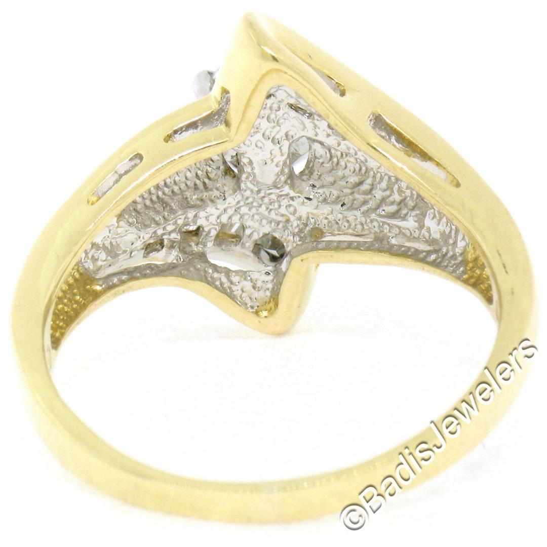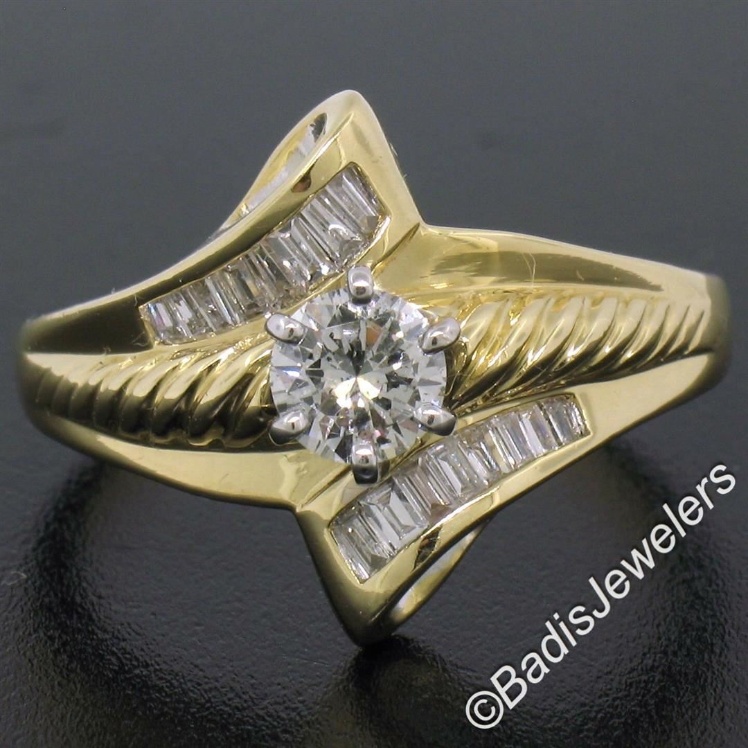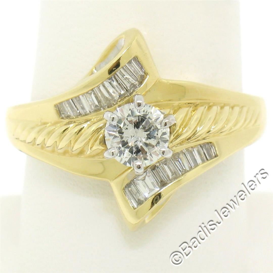 An 18kt yellow and white gold diamond bypass ring with a 0.53ct round solitaire (G - I1) and 0.37ctw of baguettes (G/H - VS2). The ring is size 8.5, weighs a total of 7.5 grams, and measures 16.5mm wide.