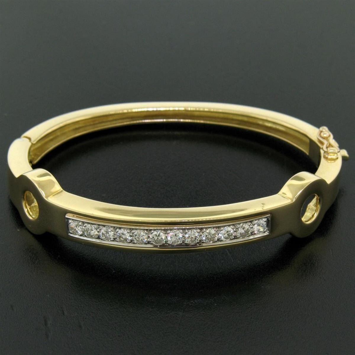 An excellent condition 18kt yellow and white gold bangle bracelet with 1.01ctw of round diamonds (F - VVS1). It weighs a total of 27.29 grams, measures 11.70mm wide, and will fit up to a 6.5 inch wrist.