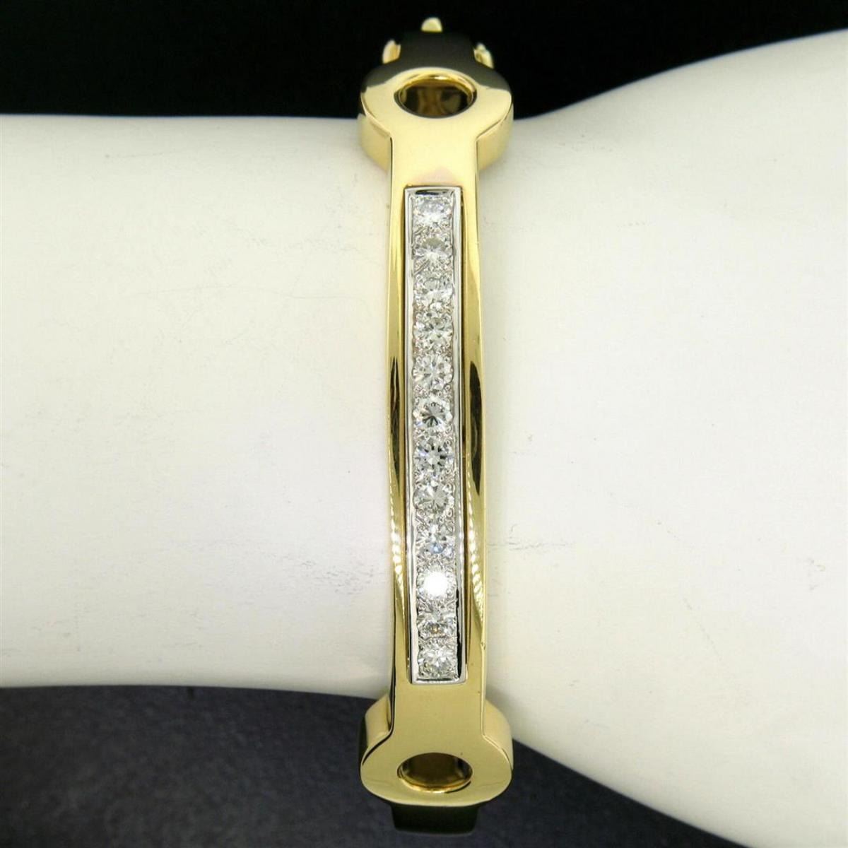 An excellent condition 18kt yellow and white gold bangle bracelet with 1.01ctw of round diamonds (F - VVS1). It weighs a total of 27.29 grams, measures 11.70mm wide, and will fit up to a 6.5 inch wrist.
