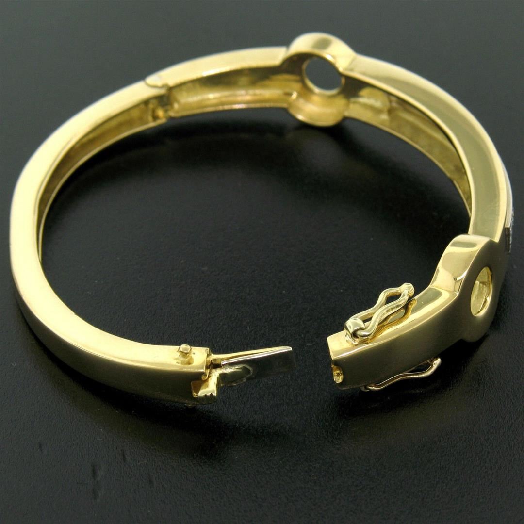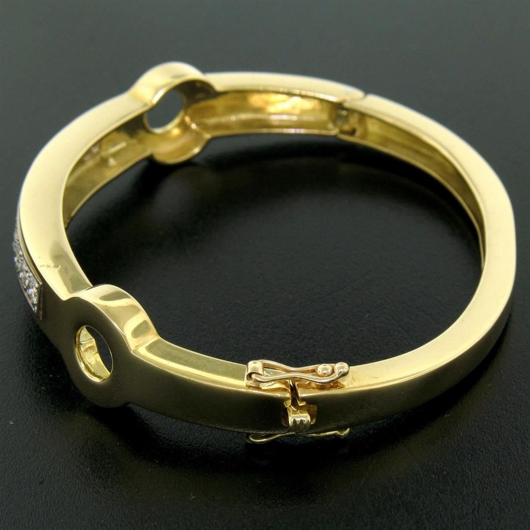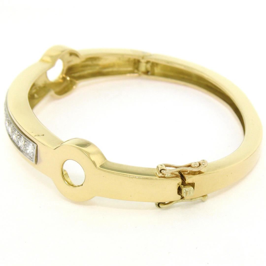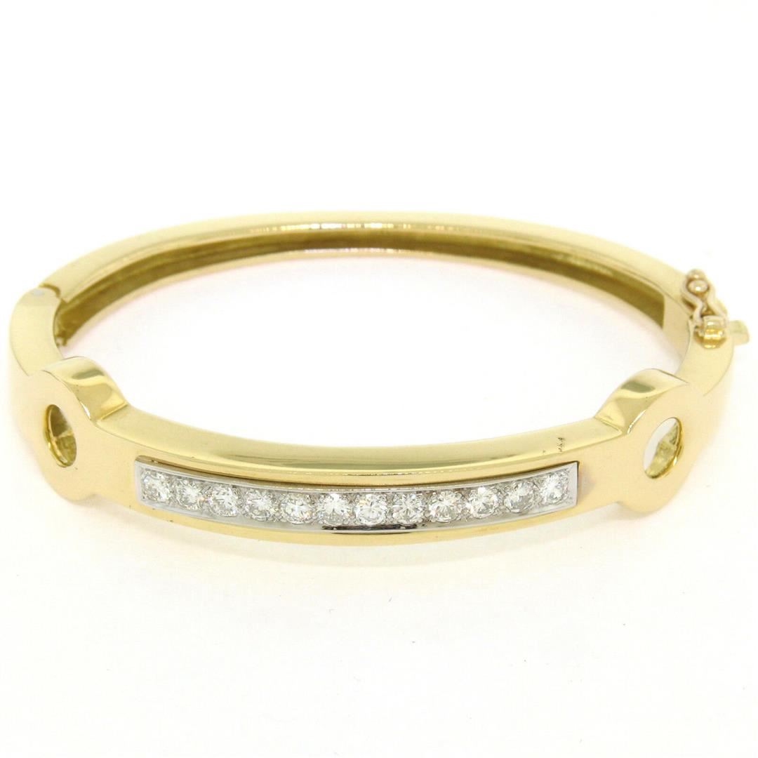 An excellent condition 18kt yellow and white gold bangle bracelet with 1.01ctw of round diamonds (F - VVS1). It weighs a total of 27.29 grams, measures 11.70mm wide, and will fit up to a 6.5 inch wrist.