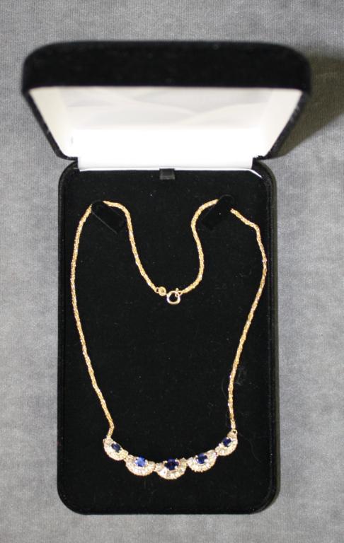 18kt custom design sapphire and diamond necklace set with 5 oval blue sapphires weighing approx 2.25ct and 76 baguette diamonds (approx 2.5ct). Est. $6,000-$10,000.