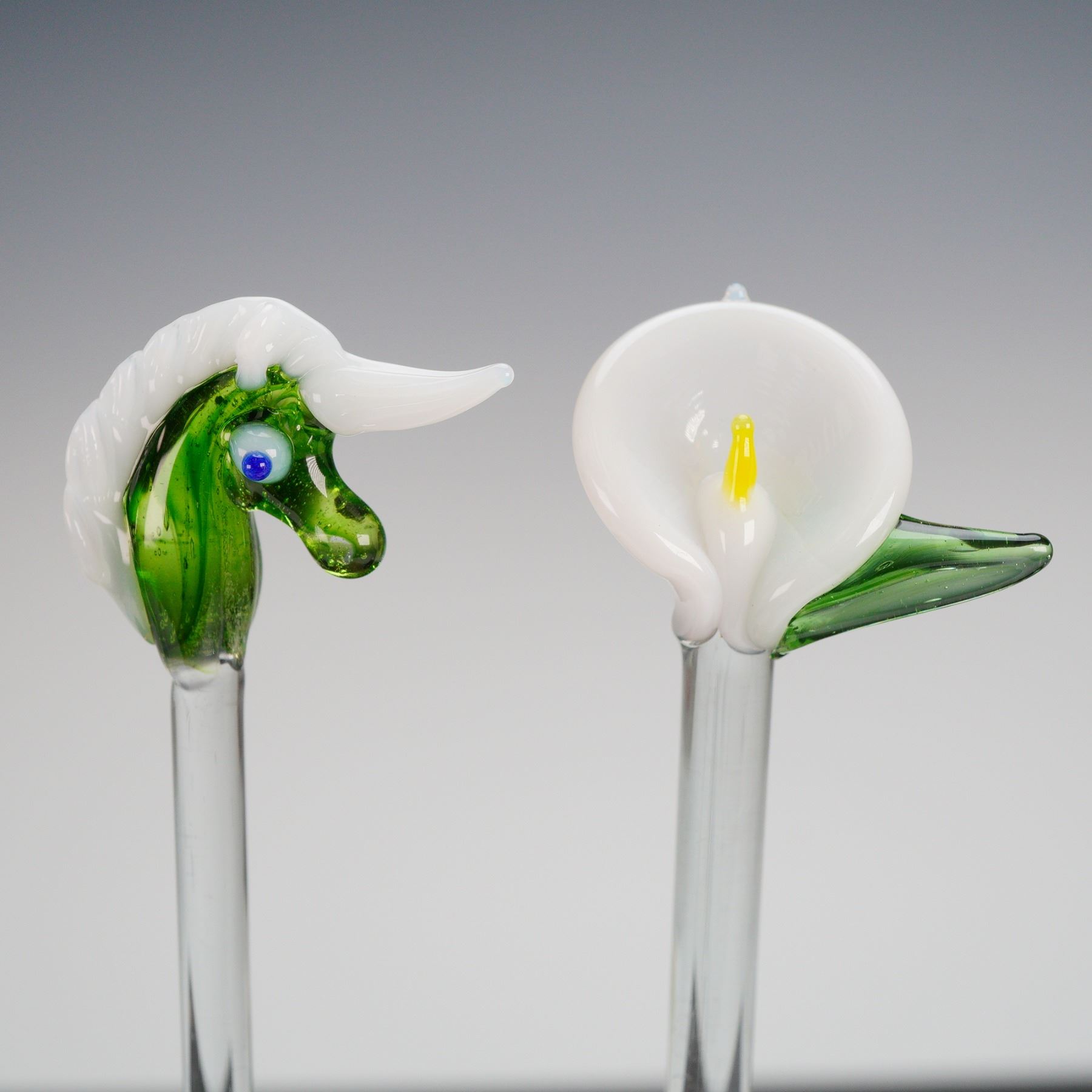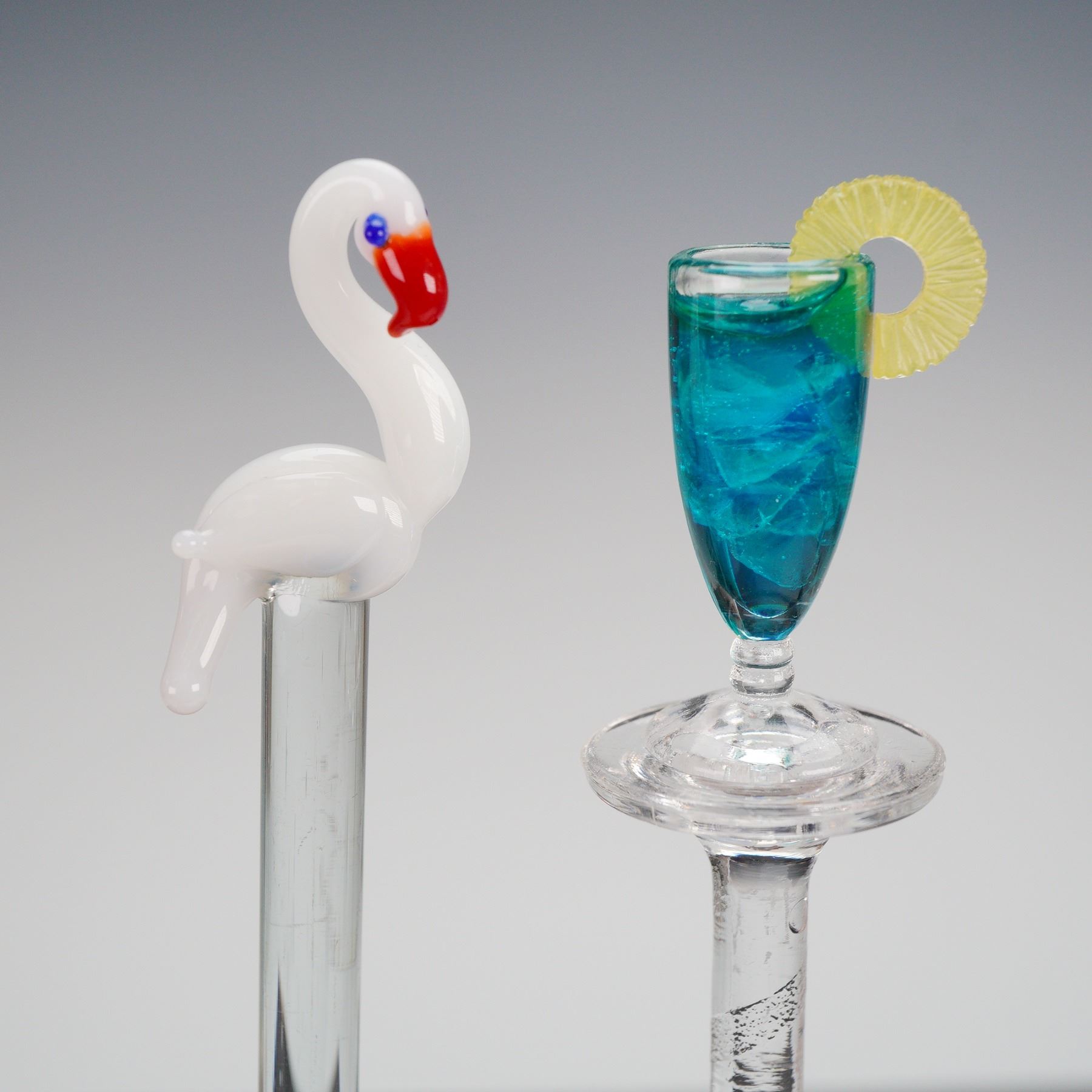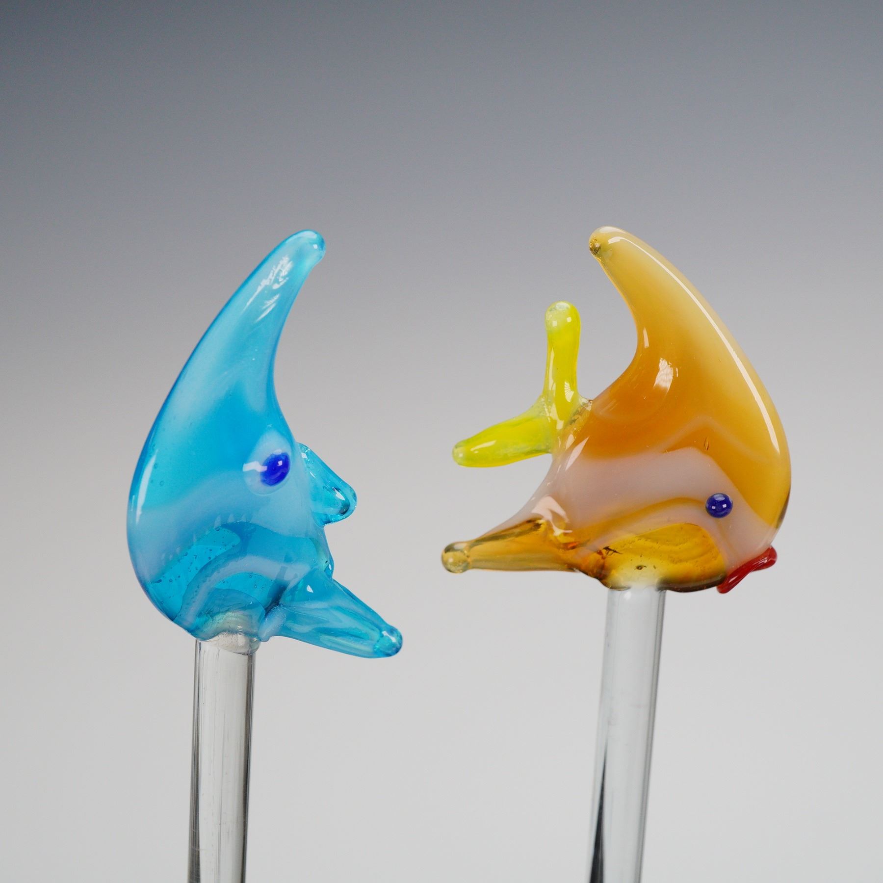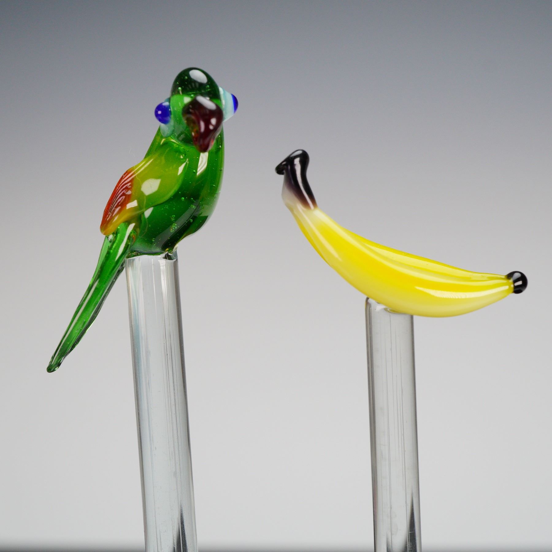 Each distinguished by a unique sculptural finial rendered in vibrant translucent hues. The assortment features whimsical motifs such as a cat, a banana, tropical fish, fruit, and other charming animals; all of various size.