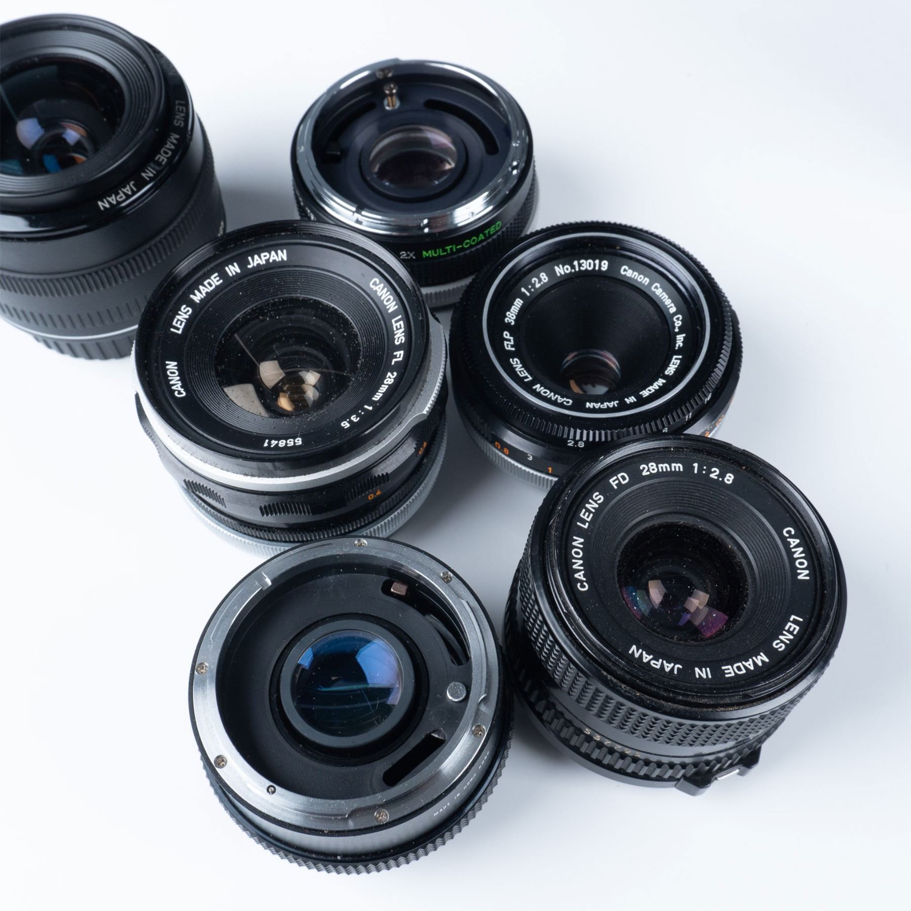 This is a comprehensive collection of Canon FD lenses and accessories, ideal for photographers and collectors of vintage Canon gear. The Canon FD mount system was widely used in the 1970s and 1980s and remains popular among analog photography enthusiasts for its optical quality and compatibility with modern mirrorless systems through adapters. This lot includes a variety of prime and zoom lenses, as well as original Canon manuals and lens caps. Collection includes: 1 M 20 extension tube; 1 Albinar Auto Tele Converter 2x; 1 Posso Auto Tele Converter 2x; 1 lens FD 28mm f/1:2.8; 1 lens FLP 38mm f/1:2.8; 1 lens EF 28mm f/1:2.8; 1 lens FL 28mm f/1:3.5; 1 zoom lens FL 100-200mm f/1:5.6; 1 zoom lens EF 75-300mm f/1:4-5.6; 1 zoom lens FD 75-200mm f/1:4.5; 2 zoom lens FD 70-210mm f/1:4; 1 dust blower; 3 lens caps; and 2 manuals. The largest lens measures: 7"H; with case: 7.5"H.