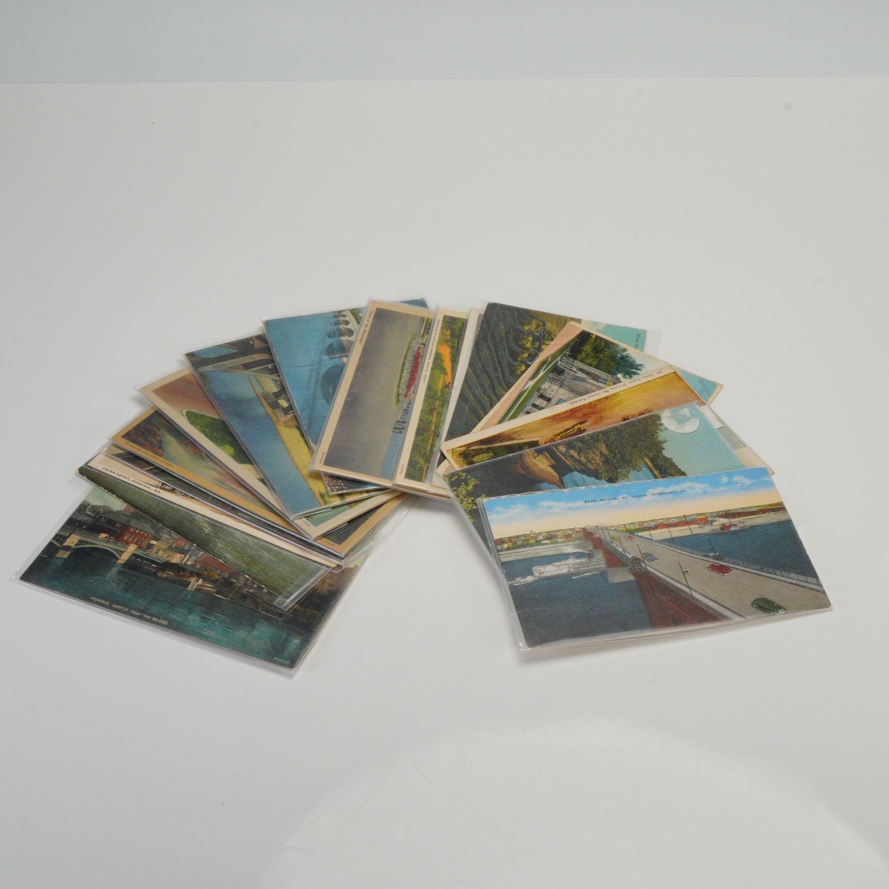An assemblage showcasing a variety of landscapes, waterways, bridges, and architectural vistas. Includes U.S. states like Virginia and Missouri, a London, Windsor postcard. Also included is a postcard from Ceylon which is now known as Sri Lanka. Includes both used and unused examples, with several bearing handwritten correspondence. Several postcards are housed in protective sleeves.