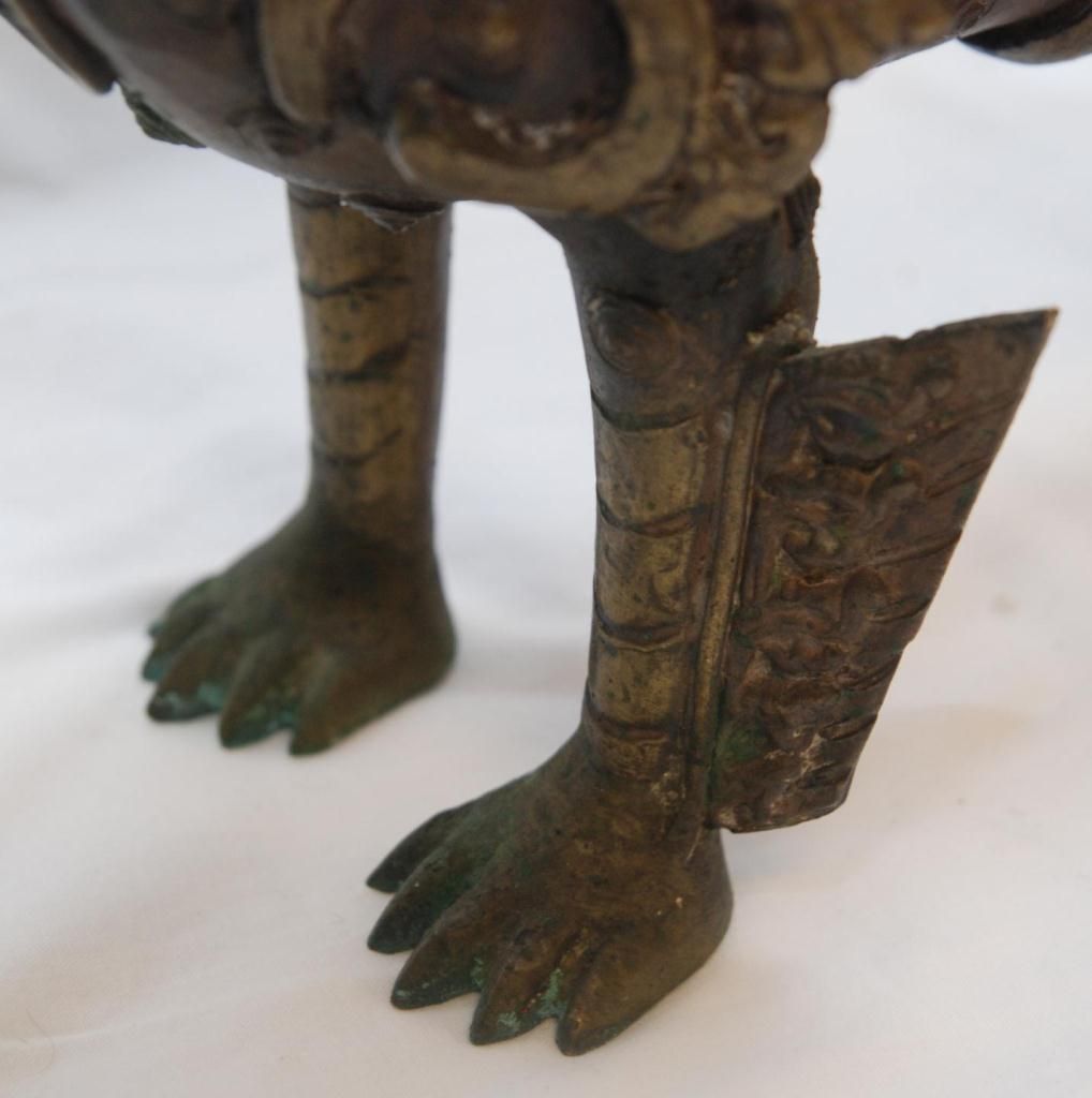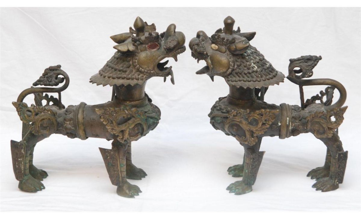Pair of antique Asian bronze foo dog sculptures. Each having raised scrolled and flared designs throughout. Each figure has ox bone inlay eyes. 18th/19th century. Each measures approx. 13 5/8" height x 12" length x 6 3/4" depth (34.6cm x 30.4cm x 17.1cm). Total weight of 11.96 kilograms.
