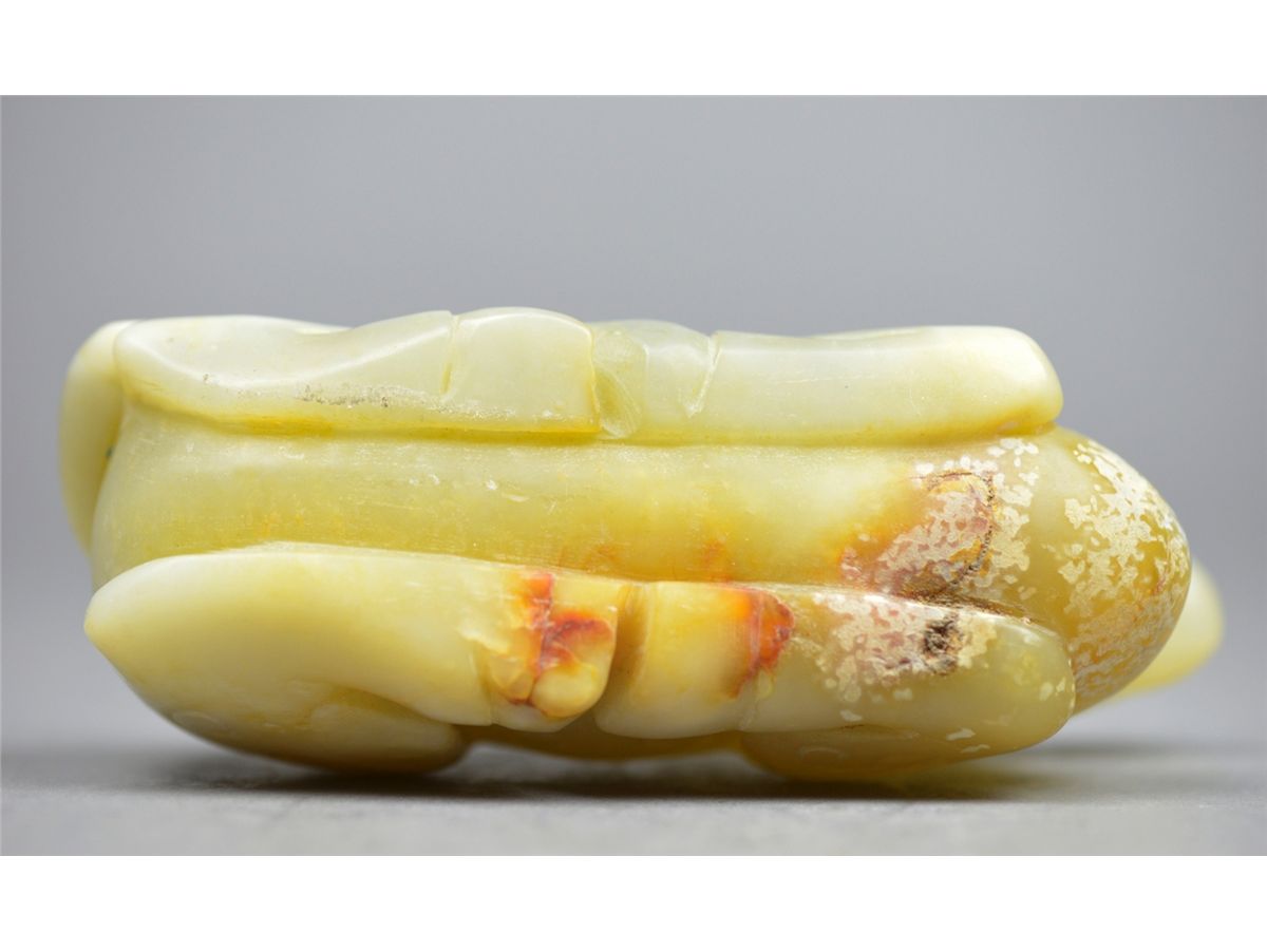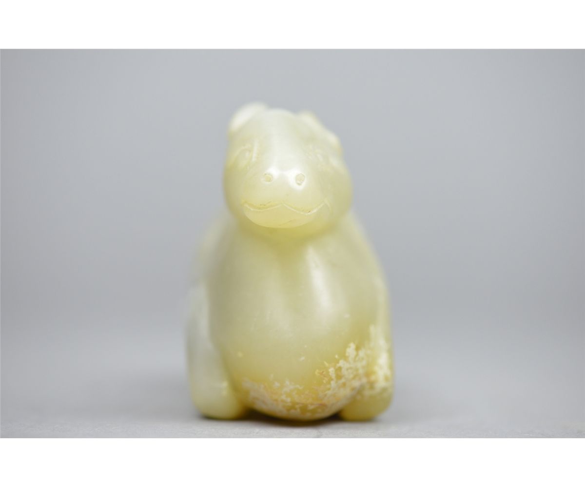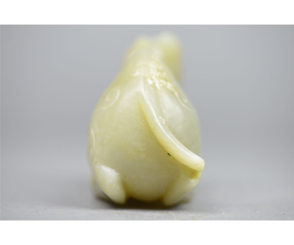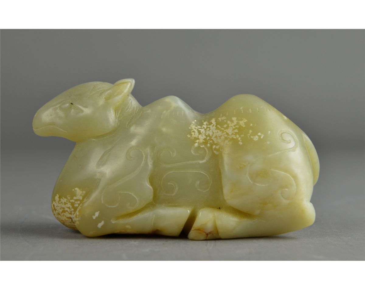 Chinese carved jade figure; featuring camel with incised ruyi-heads; the stone of translucent white tone, 18th/19th Century; L: 13 cm, W: 4.25 cm, H: 6.5 cm, 489 grams