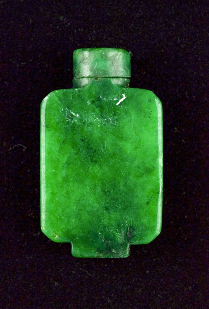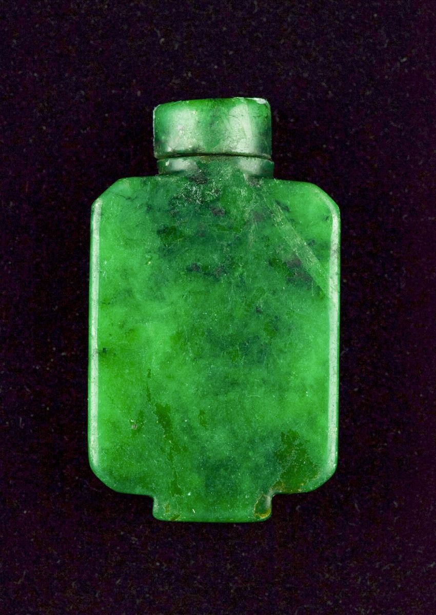 Chinese hardstone carved snuff bottle, rectangular body featuring rich translucent emerald green tone; 18th/19th Century; matching stopper and supported on short foot rim; H: 5 cm, W: 3 cm, 40 grams