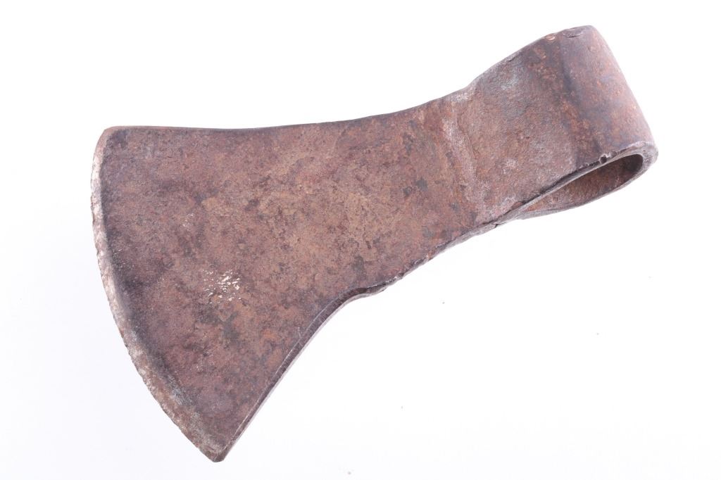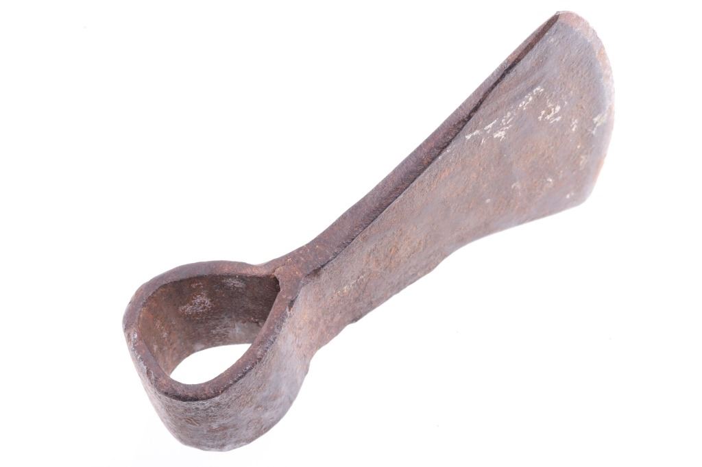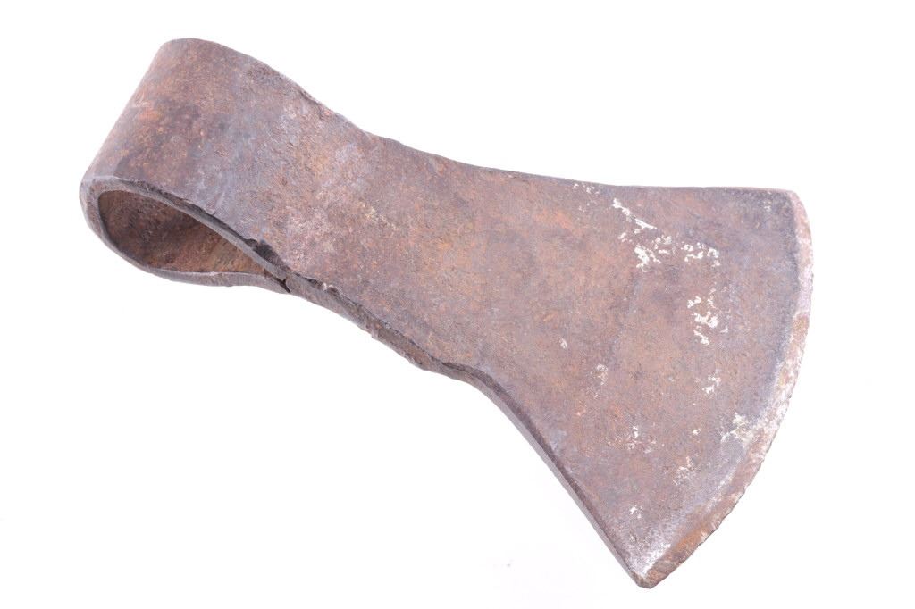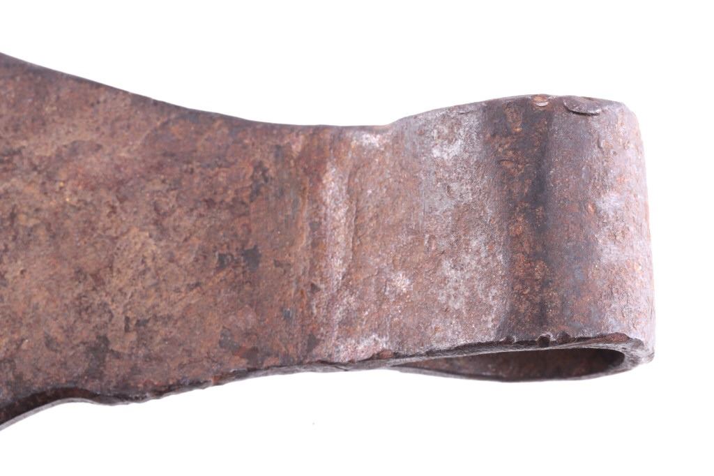 Featured in this lot is this forged French fur trading axe head, circa 18th - 19th century. The axe head shows a slight drop excurvate shape. These trade axes were typically forged in Europe, many from France, and traded to the Fur Traders, Frontiersmen, and Native American Indians during the 1700-1800’s. This example shows a heavy forged iron with hammer poll on the back of the oval eyelet hole, which has been flattened from many years of use, with traditional “French” axe blade. The condition of this axe head is good, with oxidation present consistent with the age of this axe head. The measurements of this axe head are 3 3/4" x 6" x 1 1/2".