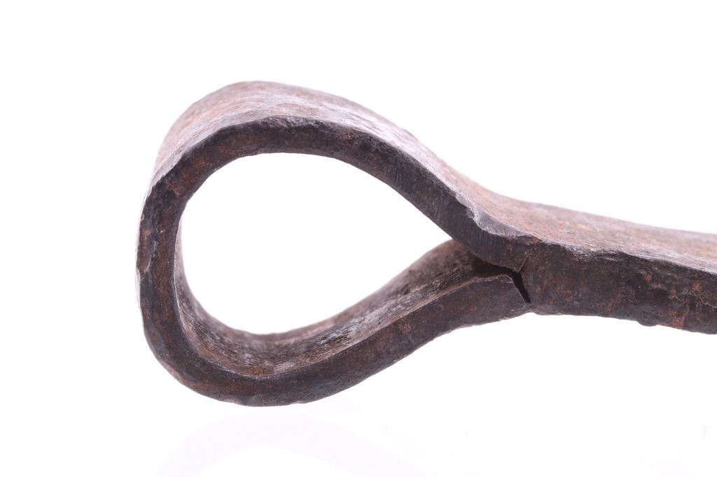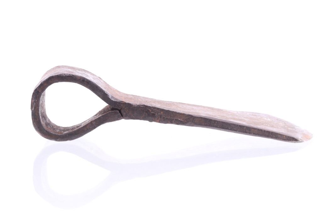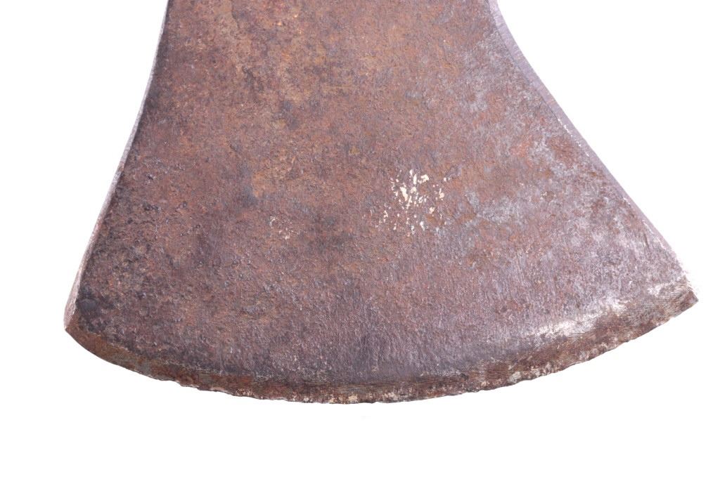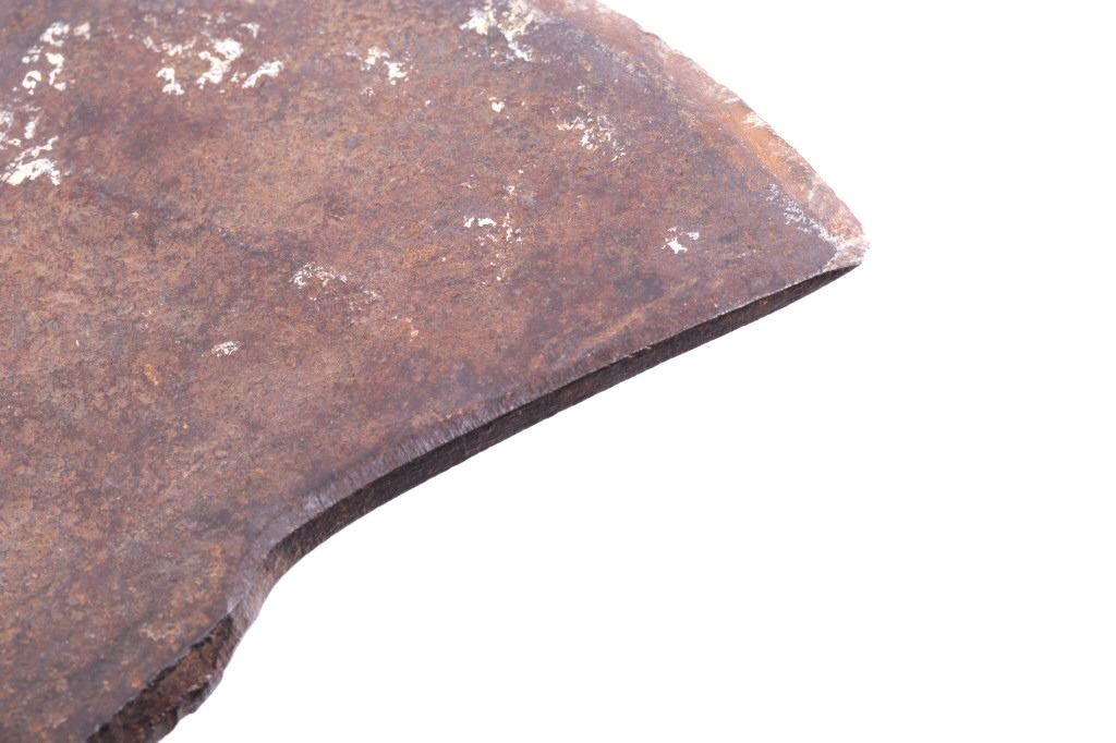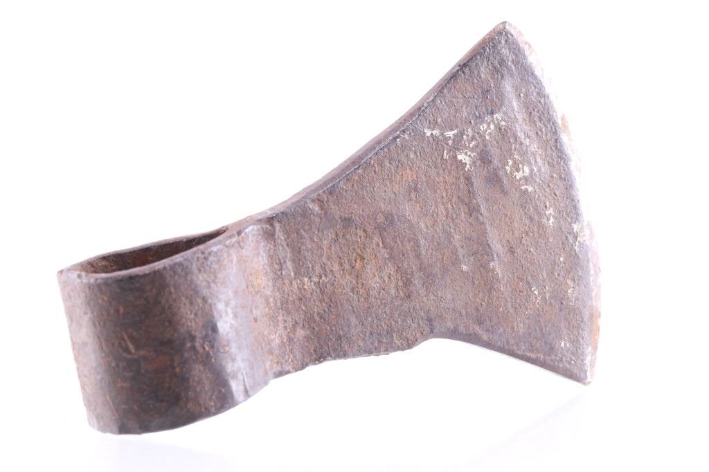 Featured in this lot is this forged French fur trading axe head, circa 18th - 19th century. The axe head shows a slight drop excurvate shape. These trade axes were typically forged in Europe, many from France, and traded to the Fur Traders, Frontiersmen, and Native American Indians during the 1700-1800’s. This example shows a heavy forged iron with hammer poll on the back of the oval eyelet hole, which has been flattened from many years of use, with traditional “French” axe blade. The condition of this axe head is good, with oxidation present consistent with the age of this axe head. The measurements of this axe head are 3 3/4" x 6" x 1 1/2".