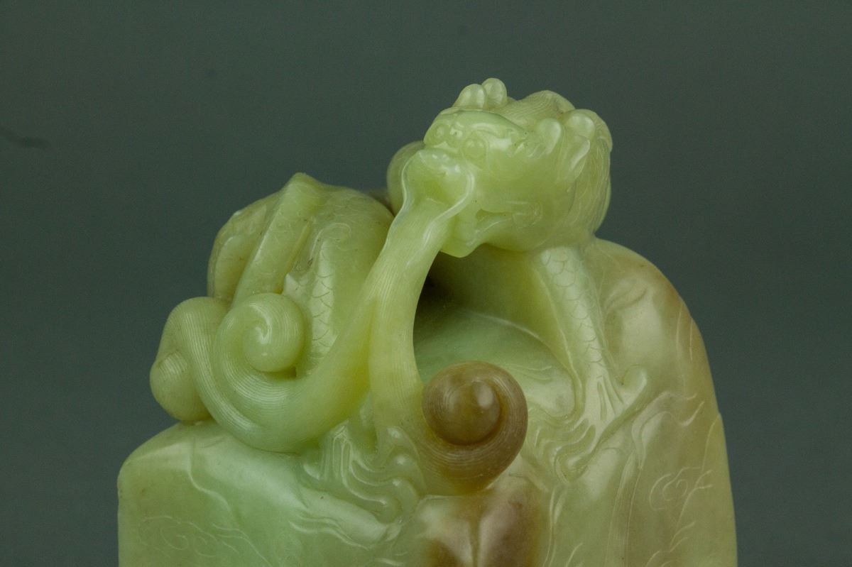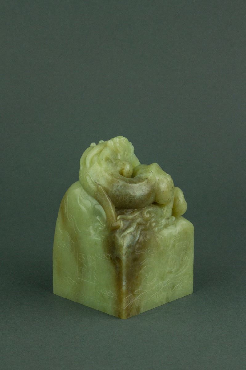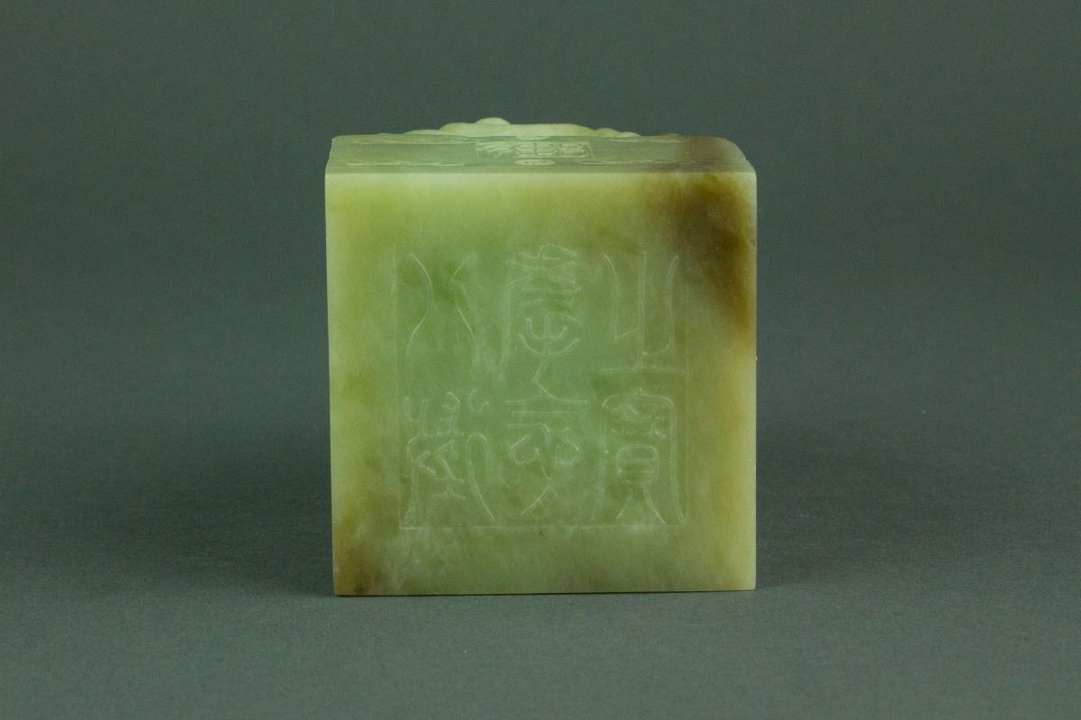 Chinese fine imperial jade seal; 18th to 19th century; of square section with thick sides; surmounted by a ferocious coiling dragon spiting dense swirling waves surrounded by its crouching body; the seal face crisply carved with eight characters Ba zheng mao nian zhi bao (Treasure of concern over phenomenon at eighty); the jade of celadon tone with russet suffusions; H: 10.5 cm, W: 6.5 cm, L: 6.7 cm, 934 grams