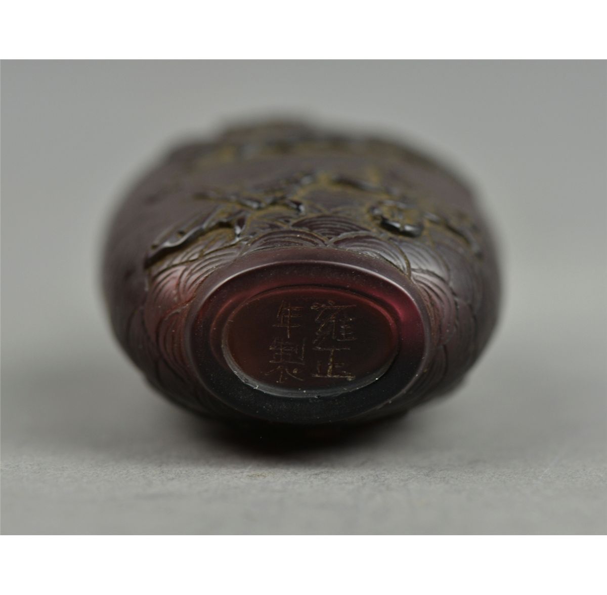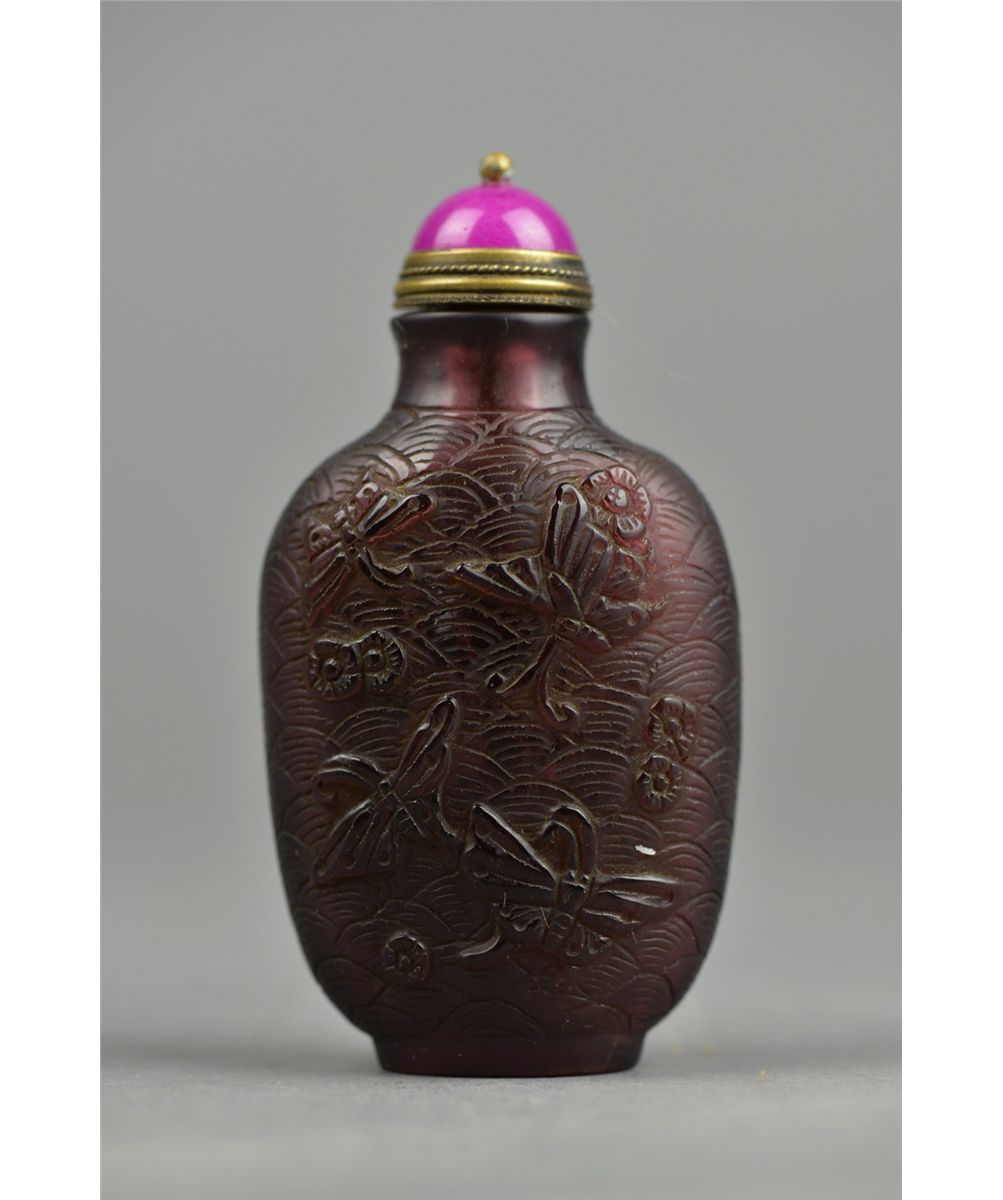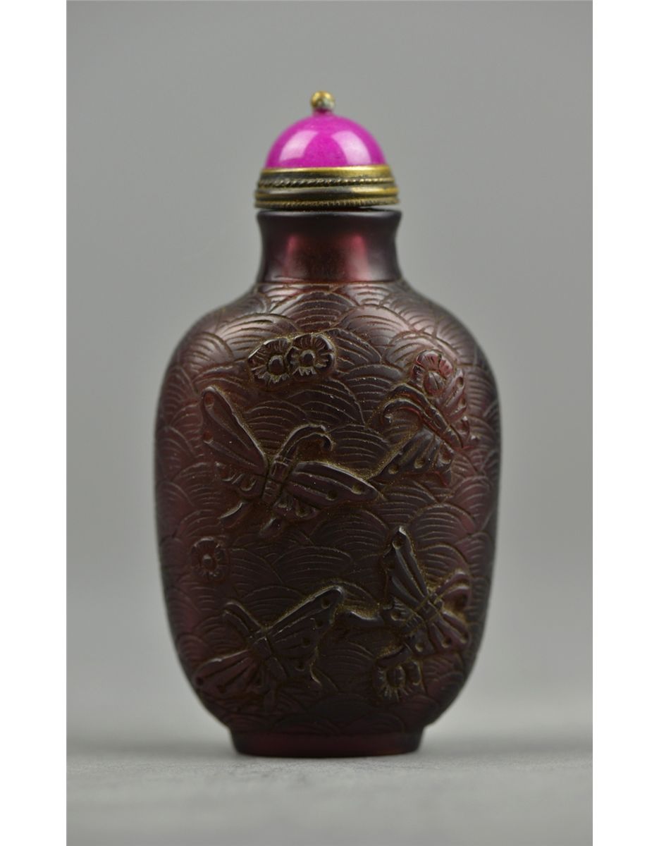 Chinese Peking Glass snuff bottle; ovoid body featuring auspicious butterfly motif in relief; four-character Yongzheng Mark on base and possibly of the Period; H: 7.5 cm, W; 3.75 cm, 54 grams. Provenance: Liao Collection Vancouver