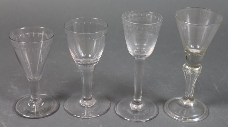 d) two piece wine glass, circa 1780, round funnel bowl with cut decorative band.