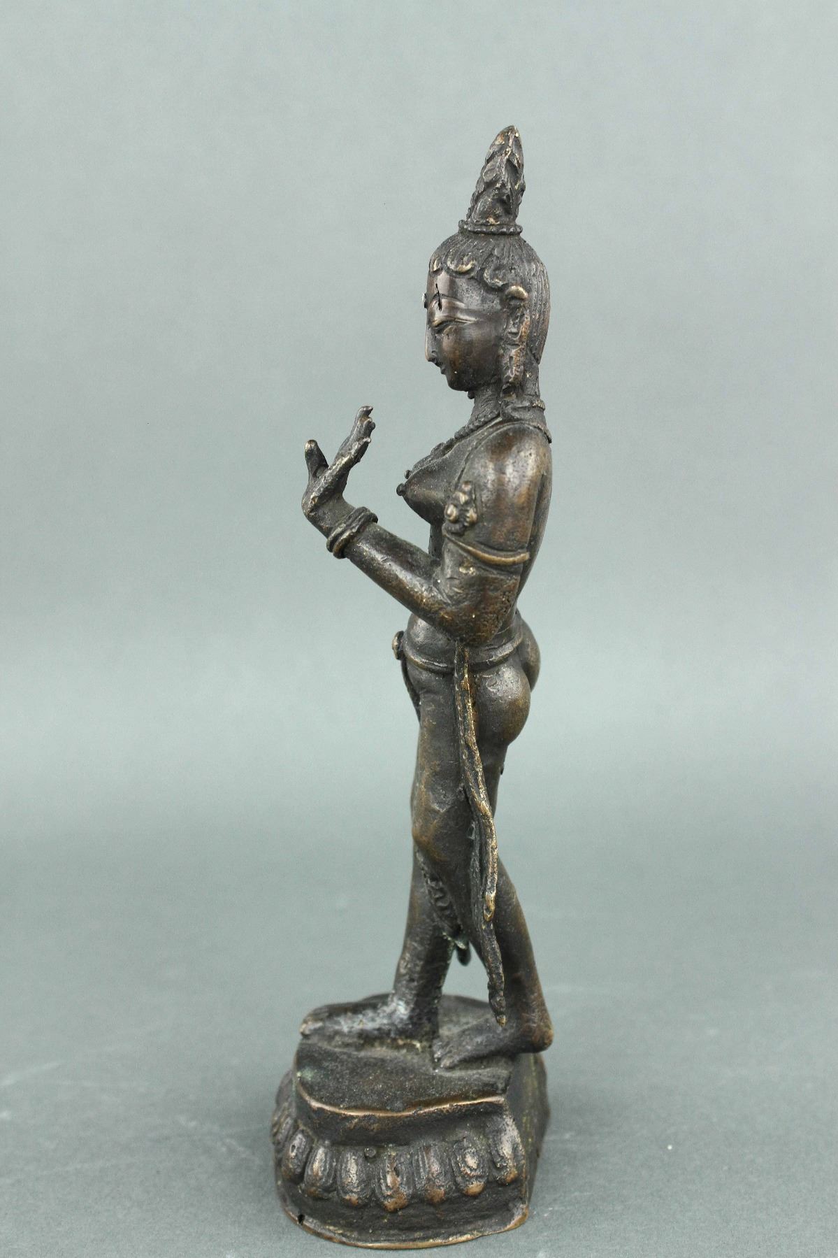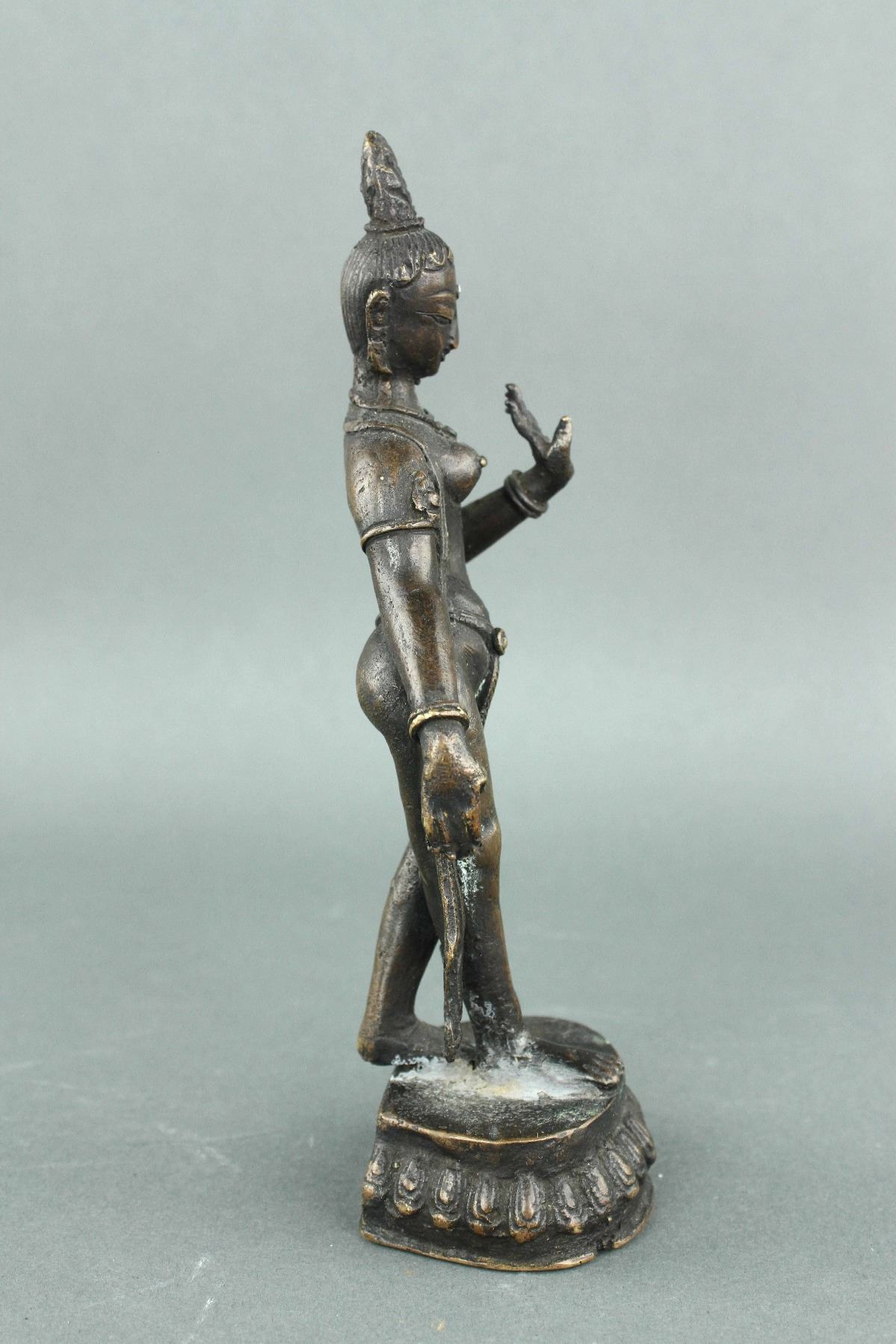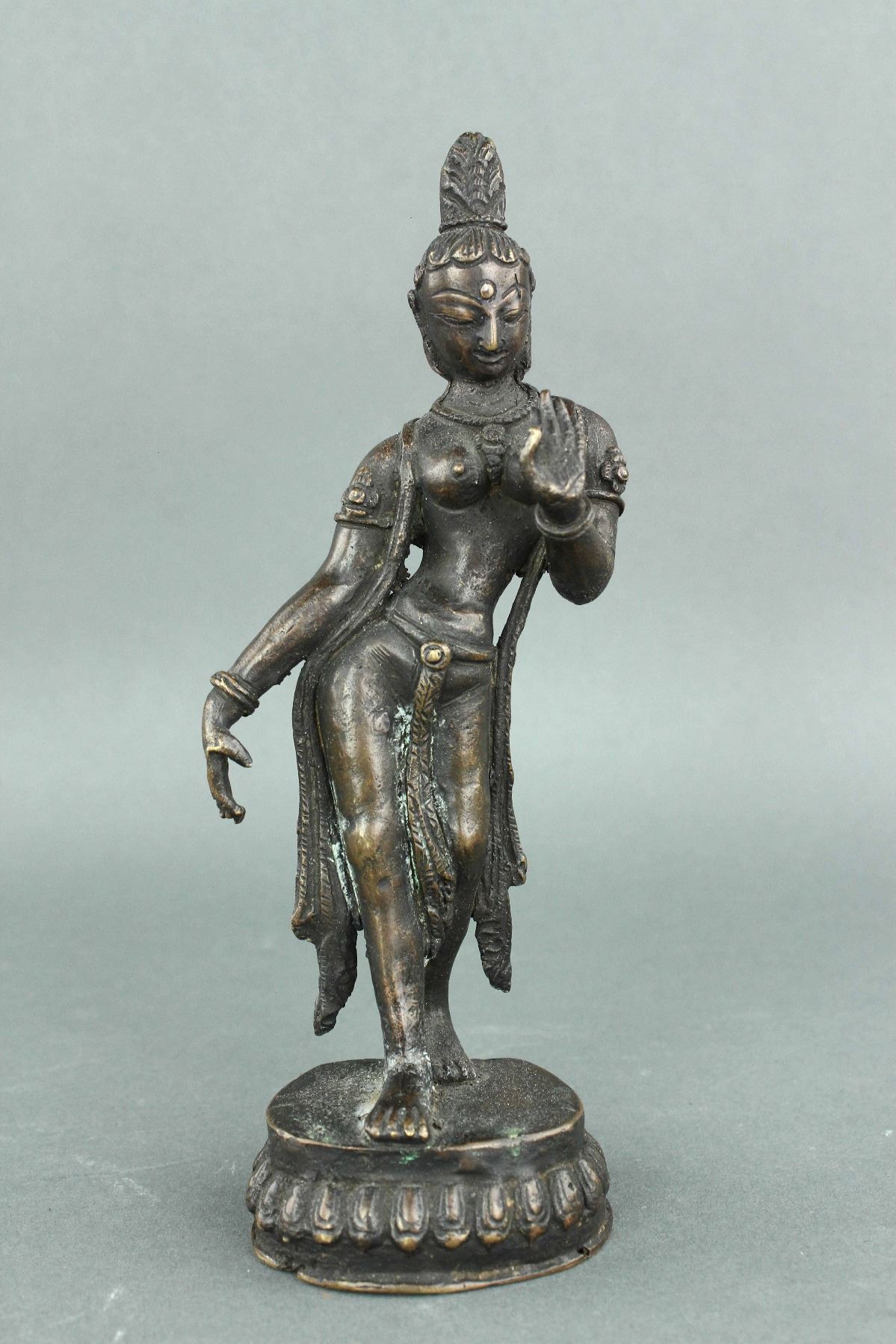 Burman or Indian bronze figure; 18th or 19th century; featuring a dancing Buddha on lotus plinth; H: 18 cm, D: 7 cm, 424 grams. PROVENANCE: Private collection (Nagoya, Japan)
