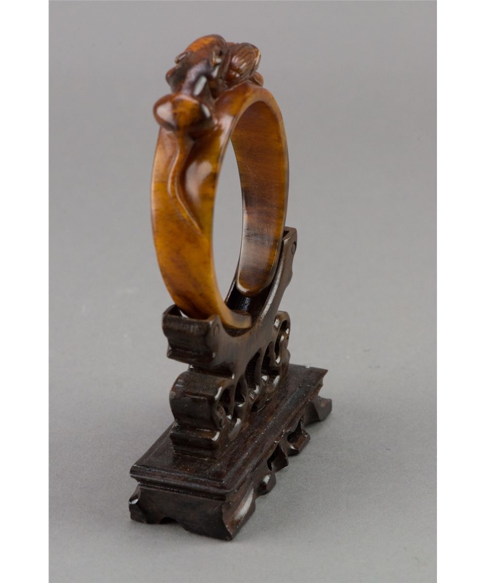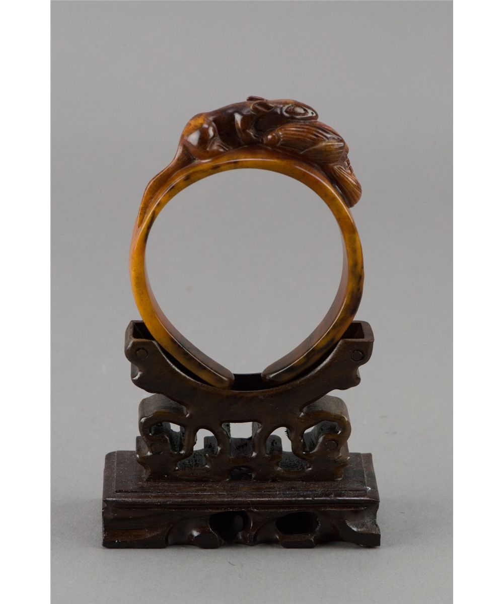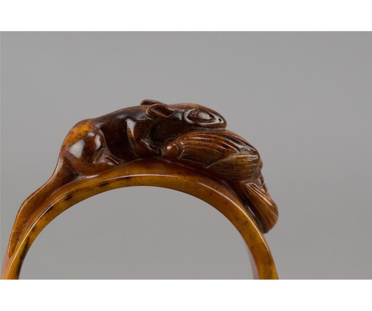 18th/ 19th Century Chinese rhinoceros horn carved bangle, of rich brown tone carved Fu mouse with cabbage, wooden stand not included; D: 7.5 cm, 32 grams