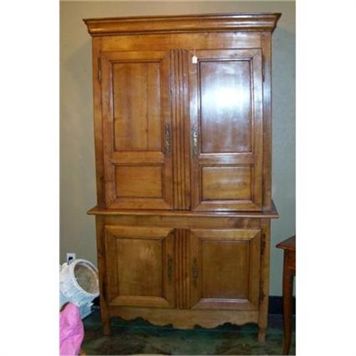 Offered here is a fine and early provincial French buffet deux corp with a beautiful mellow color, in fruitwood I believe. The doors are paneled, as are the sides, and there is a reeded section in the middle between the doors. There is a pretty, shaped apron and shaped feet. The measurements are 47" by 81".
