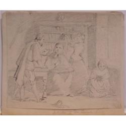 18th-19th Century Style watercolor, DESTRUCTION ON LON LUISCOTES LIBRARY, pencil drawing on wov...