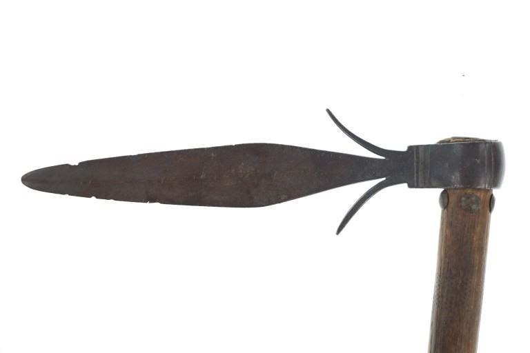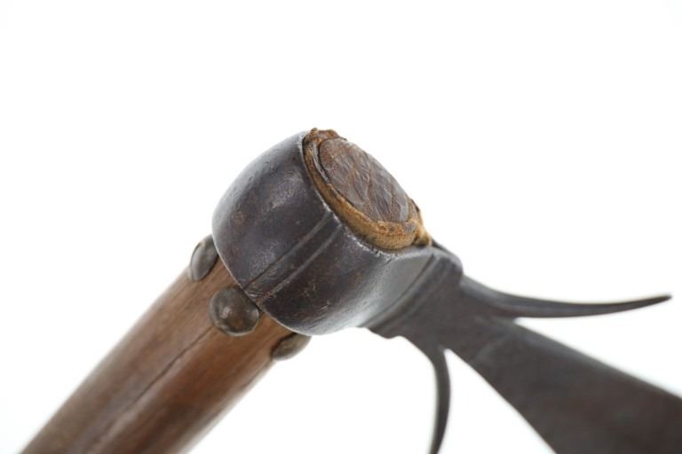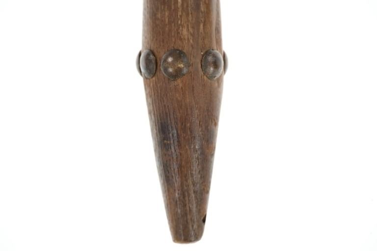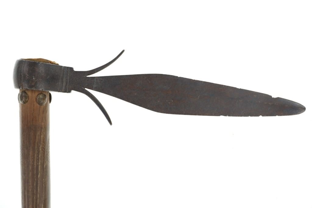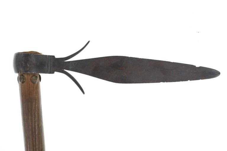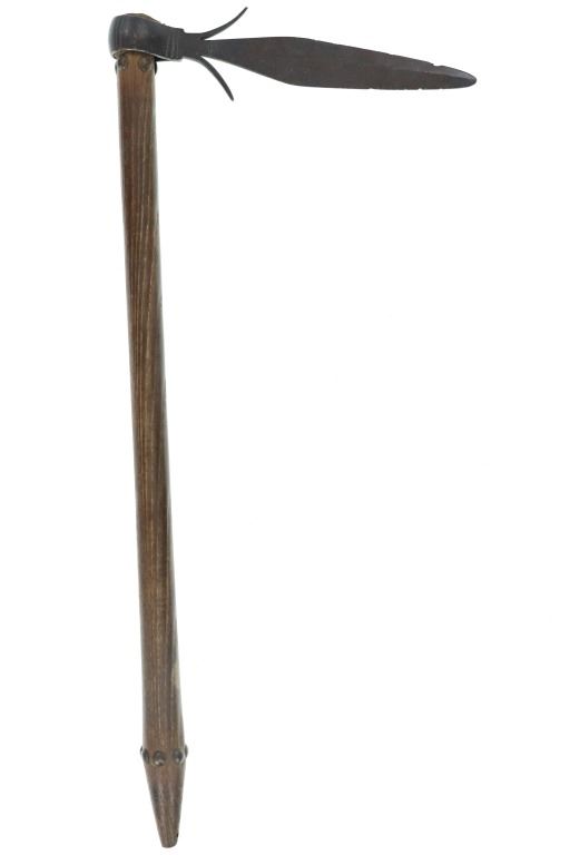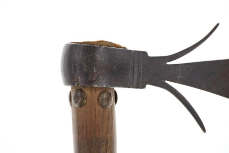 The lot features a late 1700’s early 1800’s “colonial-era” Spontoon Tomahawk from a fine collection out of Paris, France. The piece exhibits a forged iron “knife blade spontoon” or “sheep’s foot spontoon” tomahawk with a large tear drop eyelet hole blacksmith forge folded and showing a long knife blade like / kite like blade showing a punch dot engraving bordering both borders of the top of the blade. The bottom edge of the blade shows various cuts and dings. The top shows a filed band along the eye and two large flaring basal processes. The head is secured to a hardwood solid wood haft handle with original Indian hide gasket underneath the head still in place. There is a band of five old solid brass square shank trade tacks in a band near the top fo the head and at the gripping area the carved handle flares out to a diamond like shape which tapers to a rounded point with pierced hole for a drop or wrist throng, this also shows another band of seven old solid brass square shank trade tacks as well. The head has a rich, dark patina with shiny surface as well as the wood showing a dark rich coloring with shiny patina. The head is secured to the handle but can be removed and has some slight play. Provenance: From a private collection of fine Native American antiquities in Paris, France; acquired from a French collector in Aix en Provence, France. Similar to the “Fine Colonial-Era Spontoon Tomahawk sold by Jeffrey S. Evans & Associates in 2022 for $4,650; the 18th-19th century Great Lakes Tomahawk from the John Baldwin collection and in his 1999 book, “Tomahawks / Pipe Axes of the American Frontier” which sold by NAAC in 2024 for over $4,300 (both w/ bp); and the example from page 132; figure 264 pictured Spontoon tomahawk circa 1800-1810 teardrop eye from “American Indian Tomahawks” by Harold L. Peterson 1965. The piece is well kept and shows no major damages. Measures overall 22-inches long with the head being 10-inches long by 2 5/8-inches wide at the basal processes.