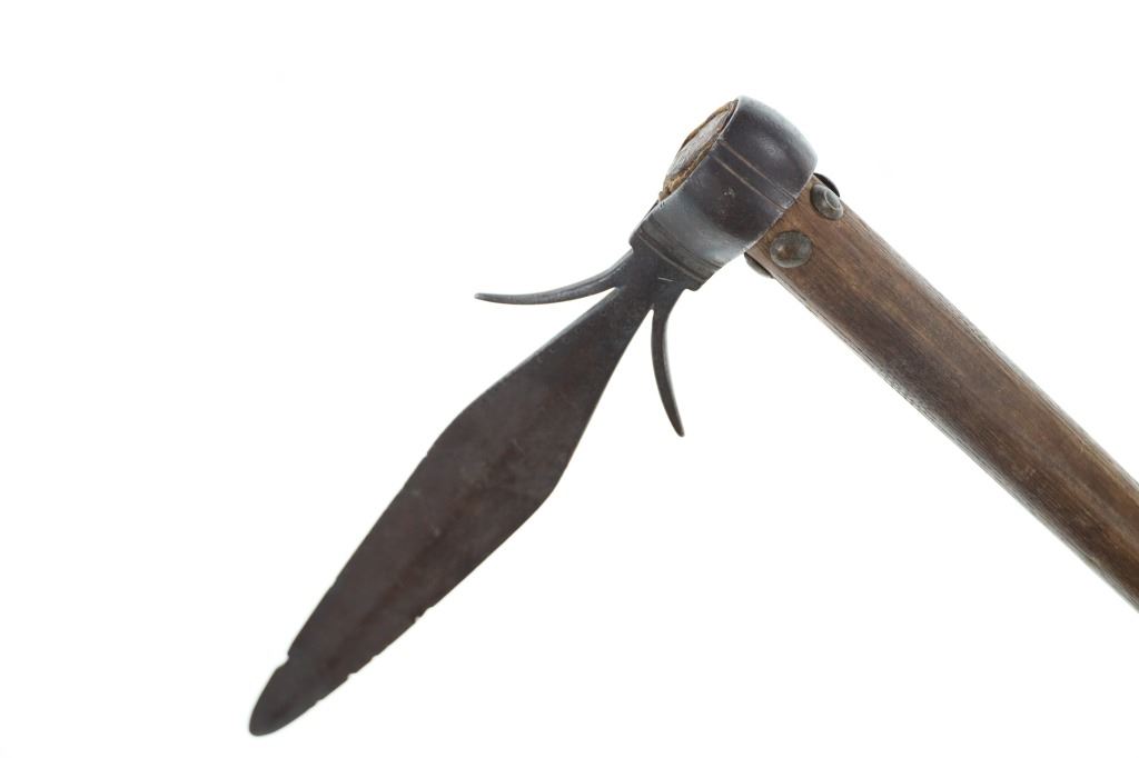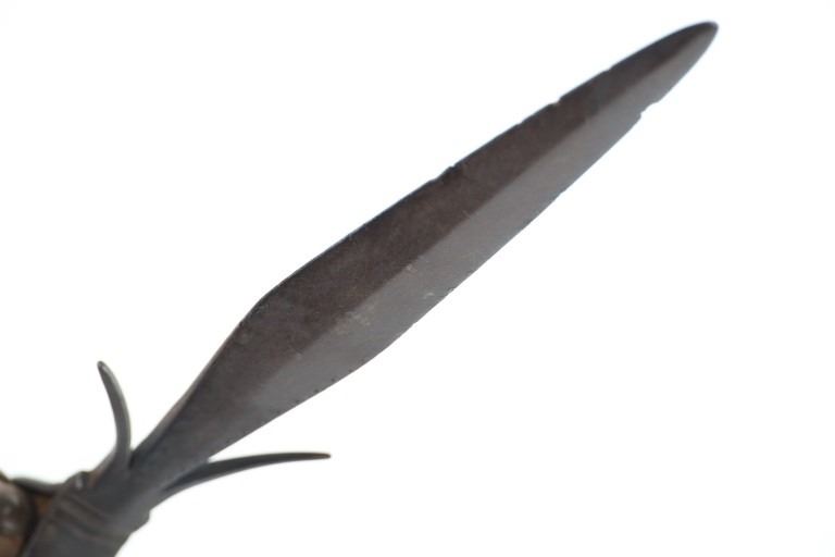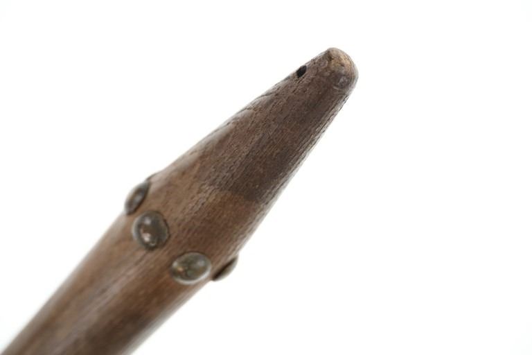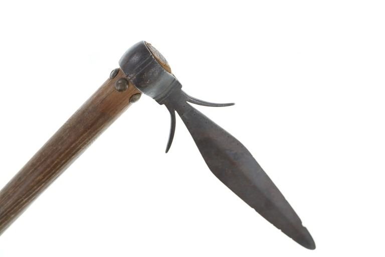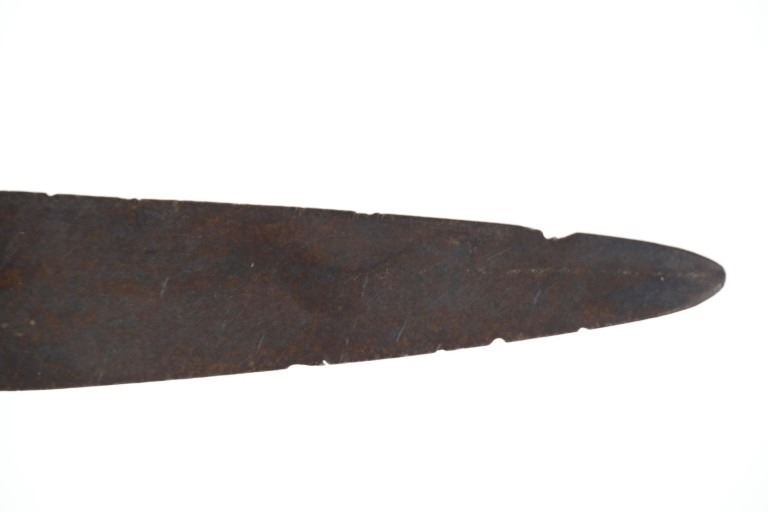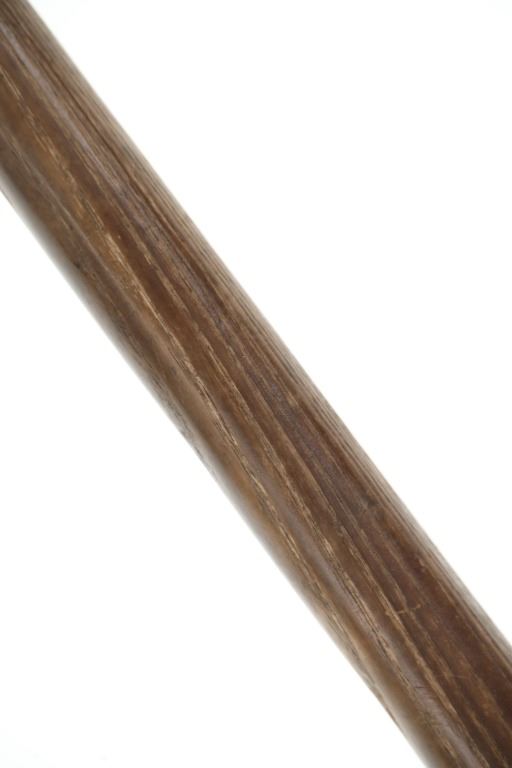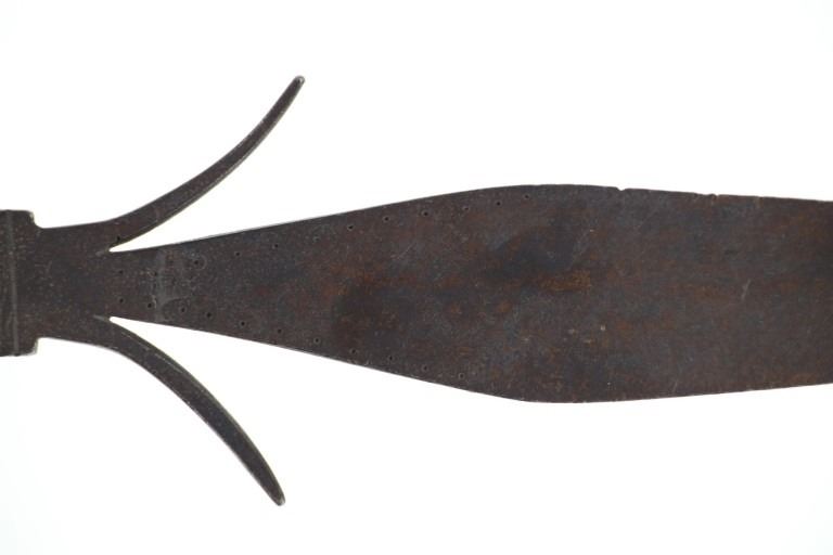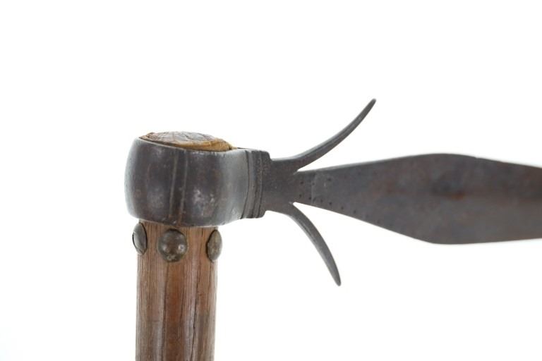 The lot features a late 1700’s early 1800’s “colonial-era” Spontoon Tomahawk from a fine collection out of Paris, France. The piece exhibits a forged iron “knife blade spontoon” or “sheep’s foot spontoon” tomahawk with a large tear drop eyelet hole blacksmith forge folded and showing a long knife blade like / kite like blade showing a punch dot engraving bordering both borders of the top of the blade. The bottom edge of the blade shows various cuts and dings. The top shows a filed band along the eye and two large flaring basal processes. The head is secured to a hardwood solid wood haft handle with original Indian hide gasket underneath the head still in place. There is a band of five old solid brass square shank trade tacks in a band near the top fo the head and at the gripping area the carved handle flares out to a diamond like shape which tapers to a rounded point with pierced hole for a drop or wrist throng, this also shows another band of seven old solid brass square shank trade tacks as well. The head has a rich, dark patina with shiny surface as well as the wood showing a dark rich coloring with shiny patina. The head is secured to the handle but can be removed and has some slight play. Provenance: From a private collection of fine Native American antiquities in Paris, France; acquired from a French collector in Aix en Provence, France. Similar to the “Fine Colonial-Era Spontoon Tomahawk sold by Jeffrey S. Evans & Associates in 2022 for $4,650; the 18th-19th century Great Lakes Tomahawk from the John Baldwin collection and in his 1999 book, “Tomahawks / Pipe Axes of the American Frontier” which sold by NAAC in 2024 for over $4,300 (both w/ bp); and the example from page 132; figure 264 pictured Spontoon tomahawk circa 1800-1810 teardrop eye from “American Indian Tomahawks” by Harold L. Peterson 1965. The piece is well kept and shows no major damages. Measures overall 22-inches long with the head being 10-inches long by 2 5/8-inches wide at the basal processes.