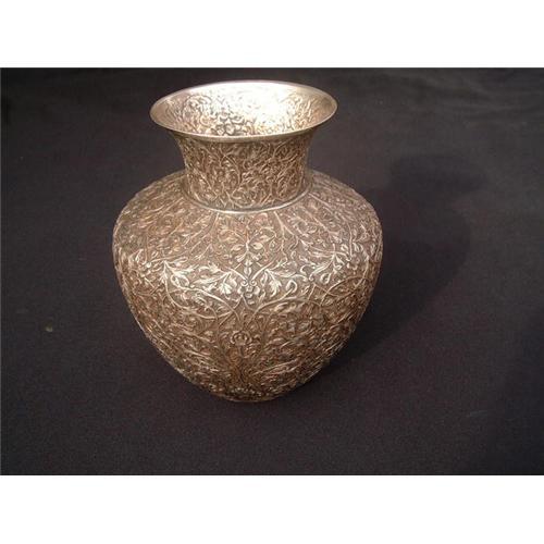 Un-excelled 18th.-19th. century Indian Moghul silver vase with very intricate high relief chiseled decorations with floral design. This is a typical Indo-Persian chiseled silver vase decorated with Islamic motif and a very rare art object. Dimensions: 19 X 18 cm. Estimated value: $15.000.