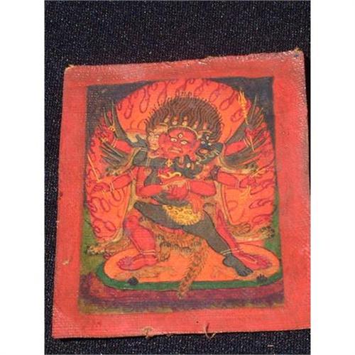 18th.-19th. century Mongolian sakhui hand painted on canvas and representing a 3-headed deity. Despite the miniature proportions, the painting is very detailed with beautiful age toning. The sakhui is related to miniature tangkas and are much rarer than hanging wall tangkas!. Estimated value: $500.