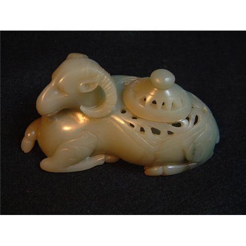 18th.-19th. century celadon green jade container in shape of a mutton. Exceptional quality of translucent green jade, homogenous with master carving details. From Dr. Veleanu's collection, the author of the collectors book: "Jade: 5000 BC to 1912 AD". Estimated value: $7.000.