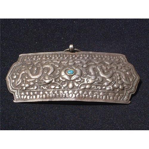 18th.-19th. century Tibetan silver belt buckle with intricate silver relief decorations and one turquoise carving.This large silver belt buckle is decorated with 2 dragons facing the flaming pearl made from turquoise and surrounded by 2 fish. Magnificent relief work in silver of monumental proportion and very rare! Estimated value: $1.000.