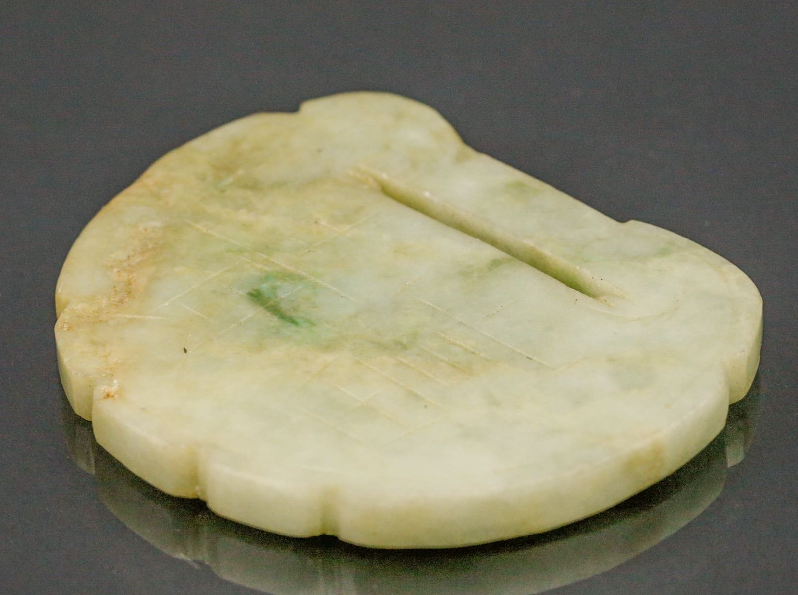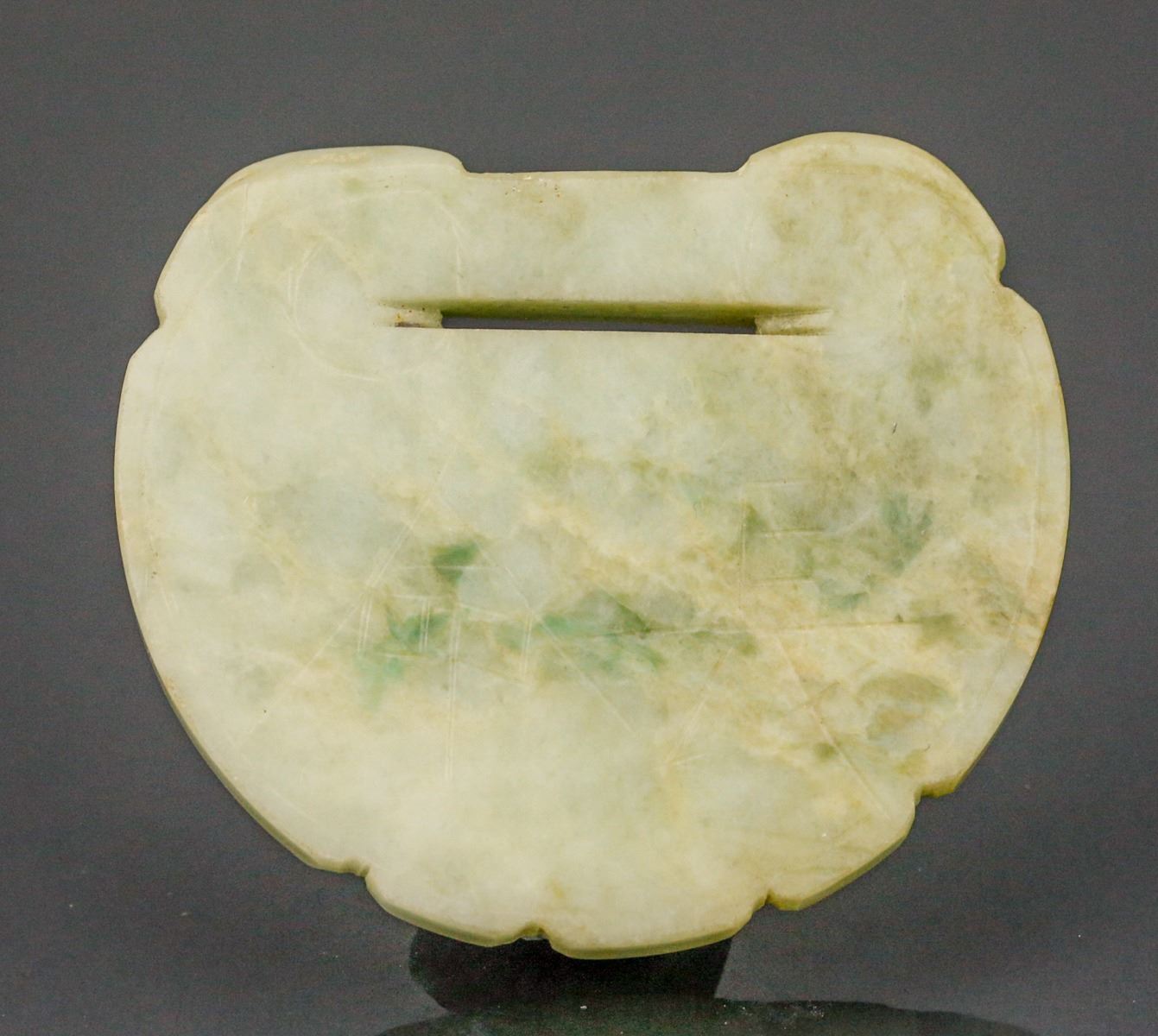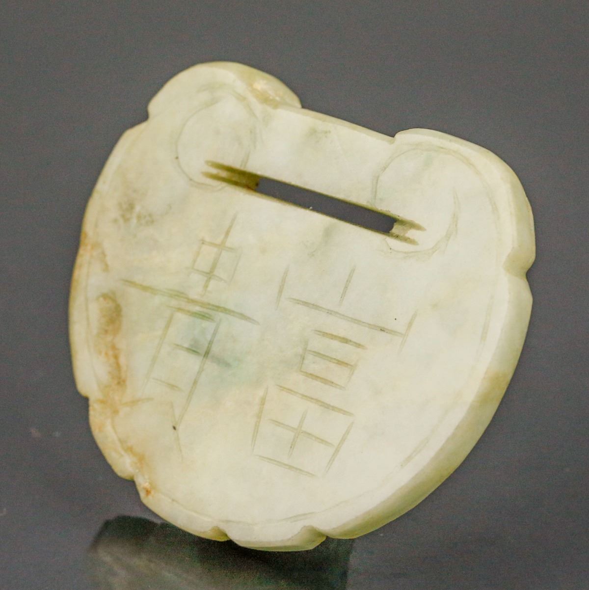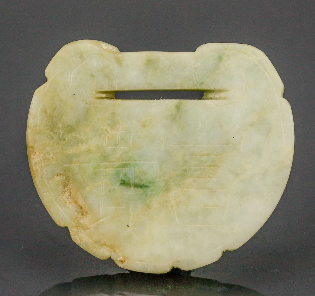 18th century Burma green jadeite carved pendant, of ruyi lock form, featuring carvings of Chinese characters Chang Ming Fu Gui on both sides, of apple green tone with russet suffusions, H: 6 cm, W: 5 cm, 39 grams, Density: 3.27