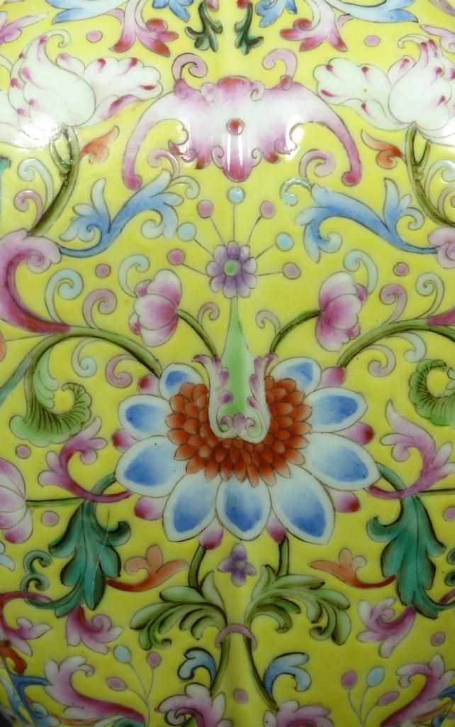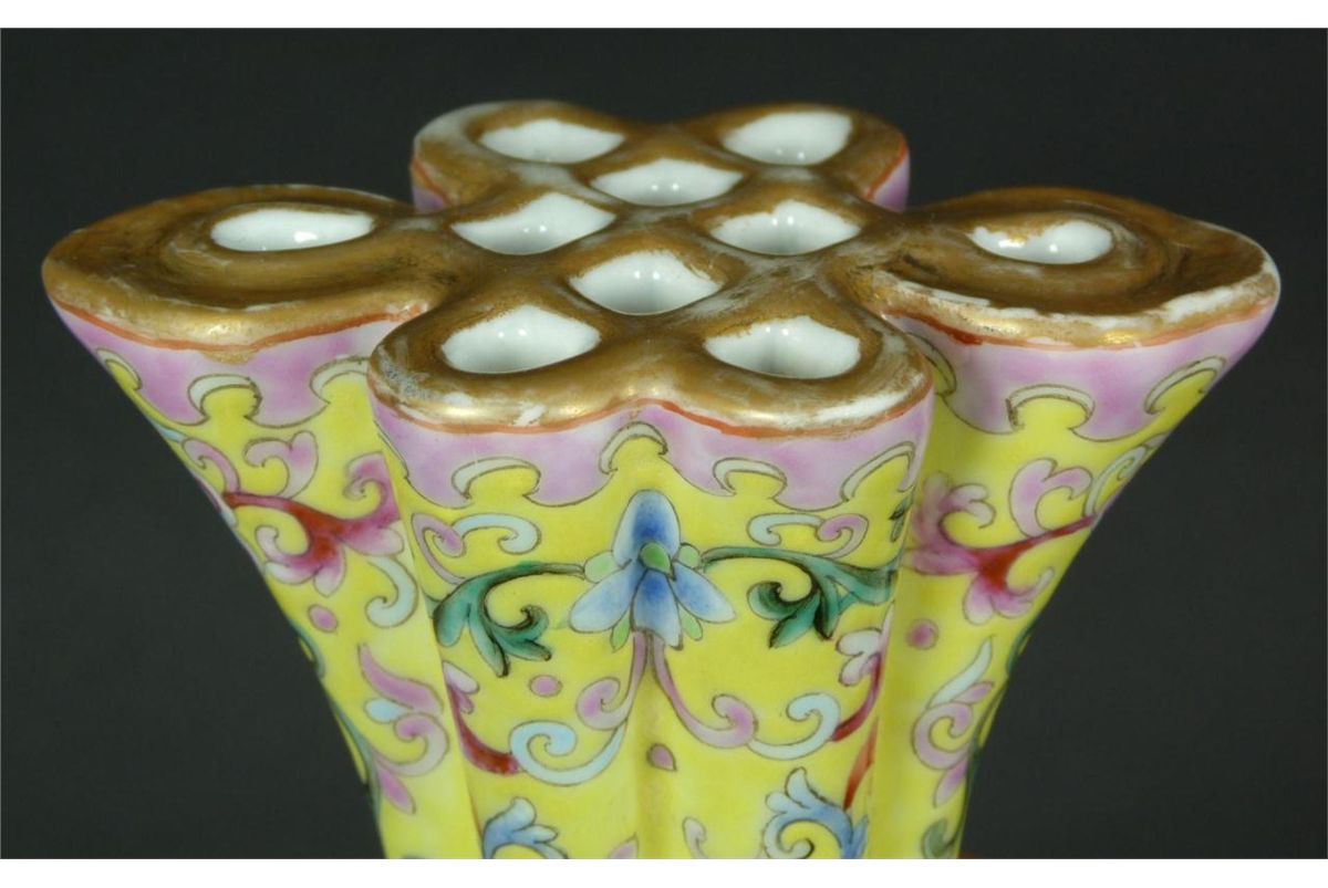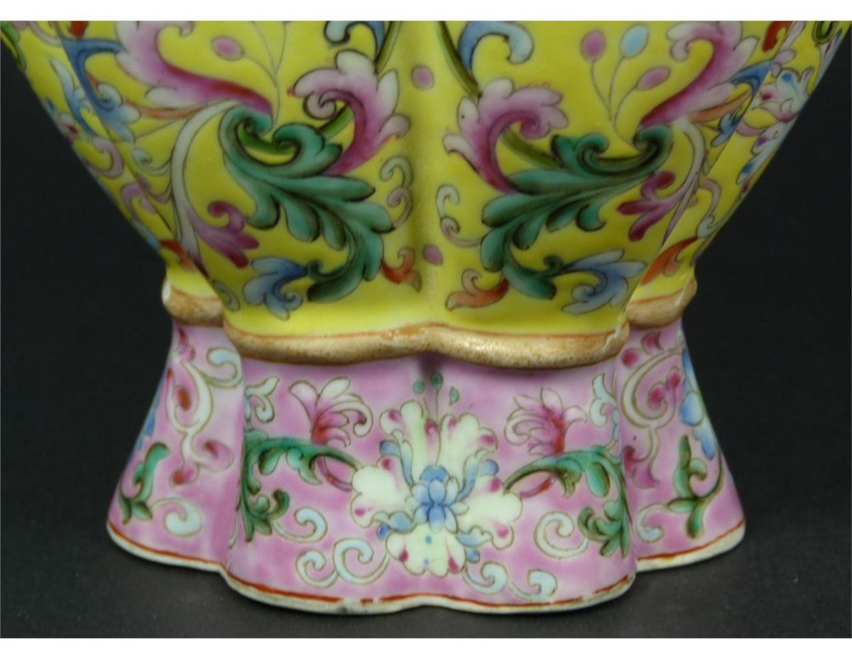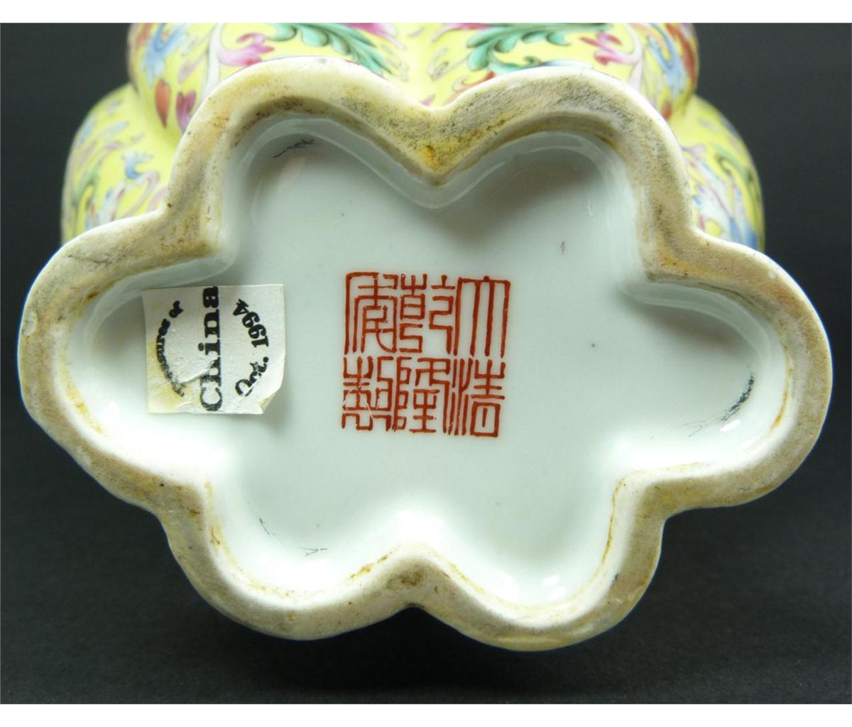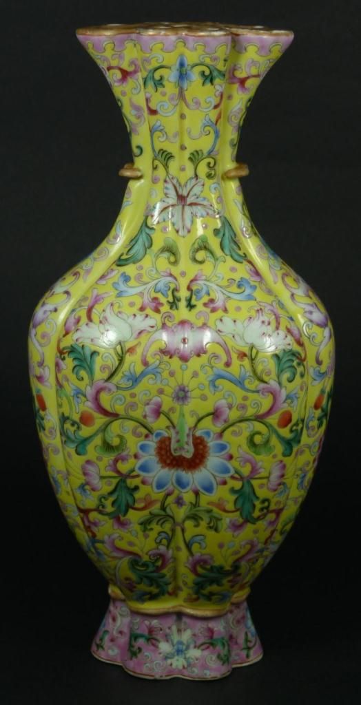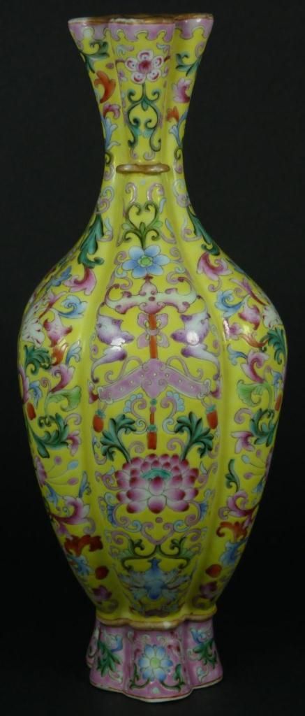 An antique Chinese Qing Dynasty period Famille Rose hand painted enameled vase. Has multi mouthed 'Endless Knot' design to top of vase. Body depicts a floral design with scrolled vines and leaves over yellow ground. Bottom holds red six character archaic Qianlong (1736-1795) reign mark, and is made of the period. Measures 11 3/8" height (28.9cm). Total weight of 1154 grams. Provenance: From The Dr. Rowe Collection. Exhibited at 'Treasures of China 1994 - Longwood Arts Visual' and holds label to bottom.