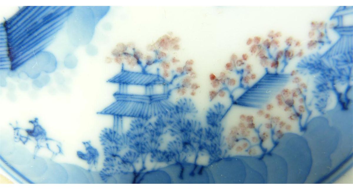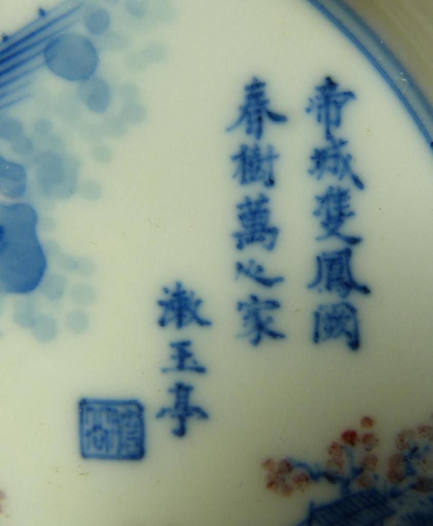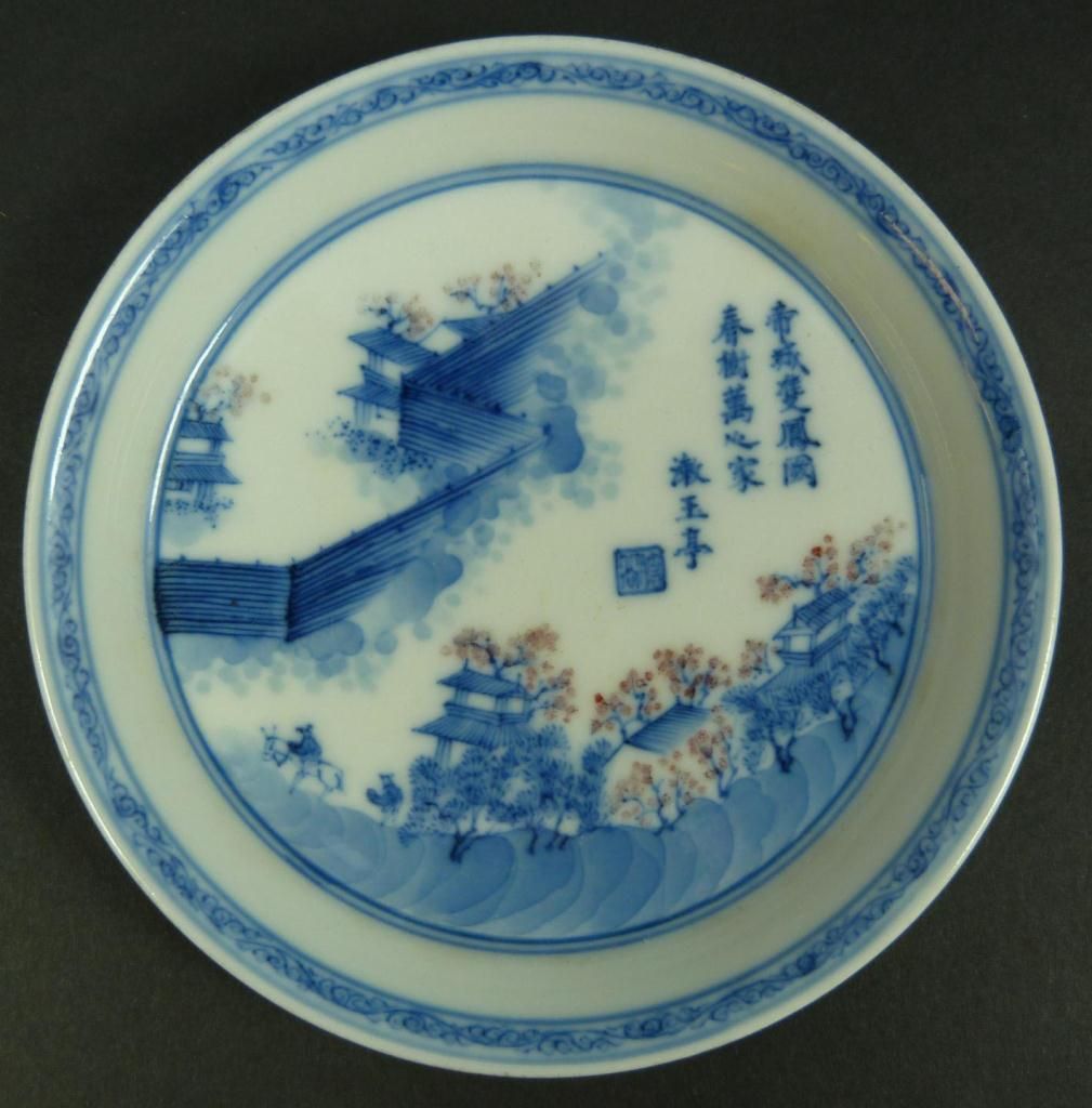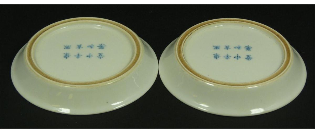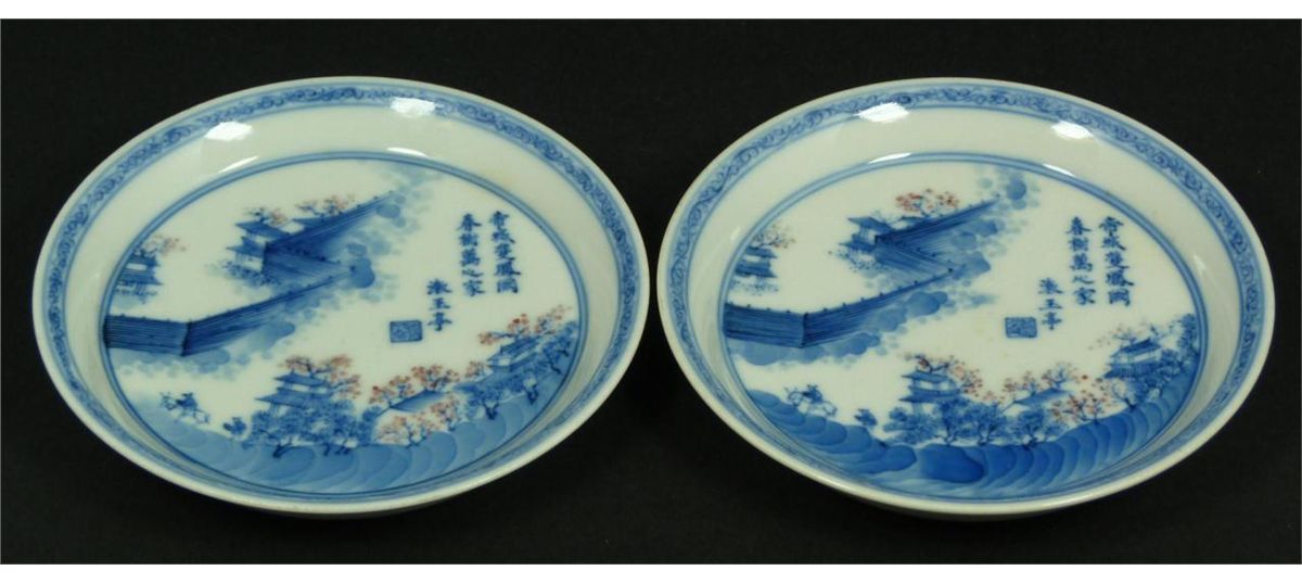 A pair of antique Chinese Qing Dynasty period hand painted porcelain village scene dishes. Each depicting pagodas near a wall and having calligraphy poem to upper right. Holds eight character blue calligraphy Qing Dynasty period marks to bottom. Each measures 4 1/2" diameter (11.4cm). Total weight of 172 grams.