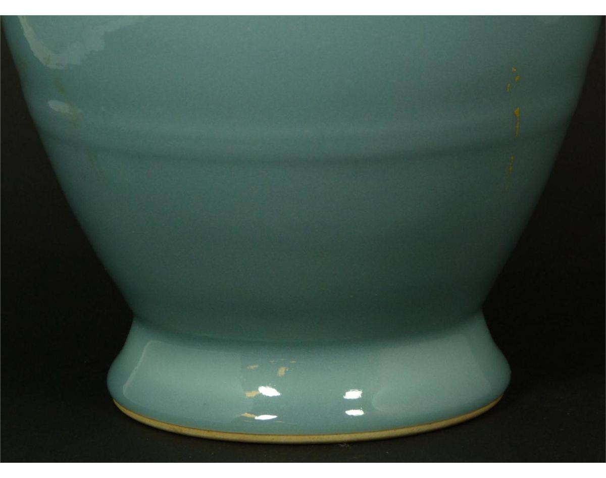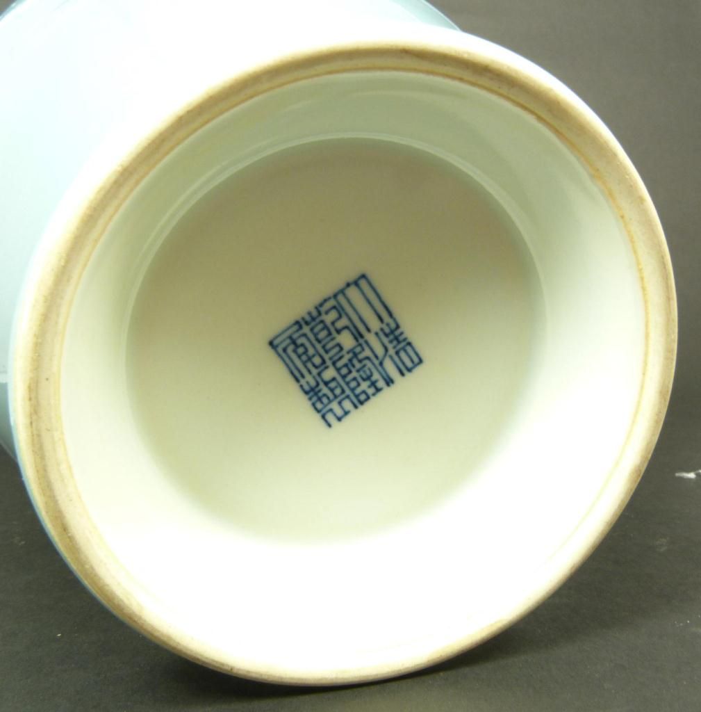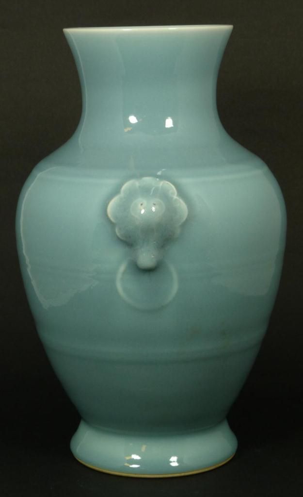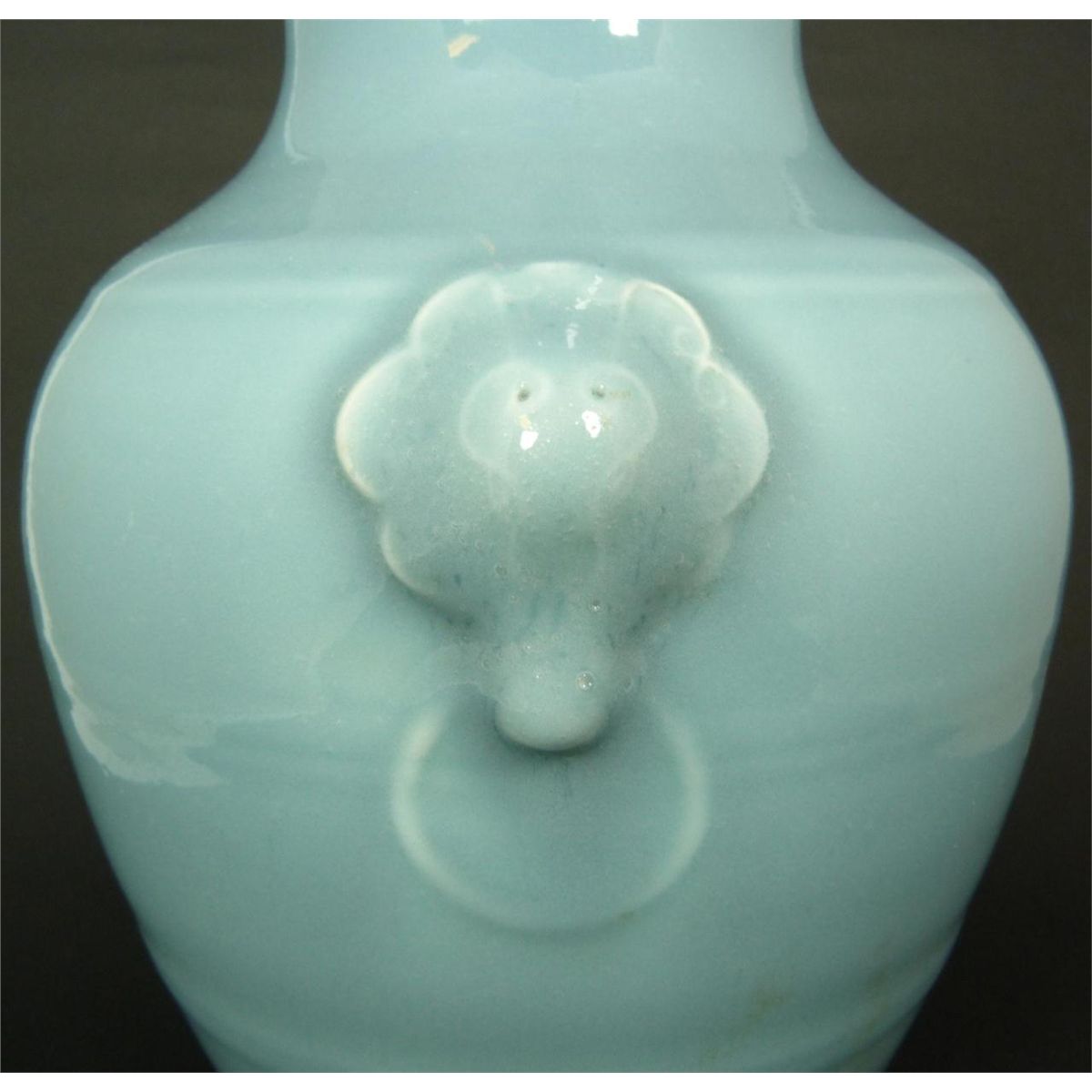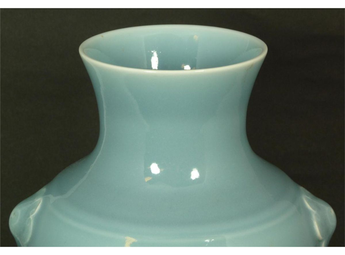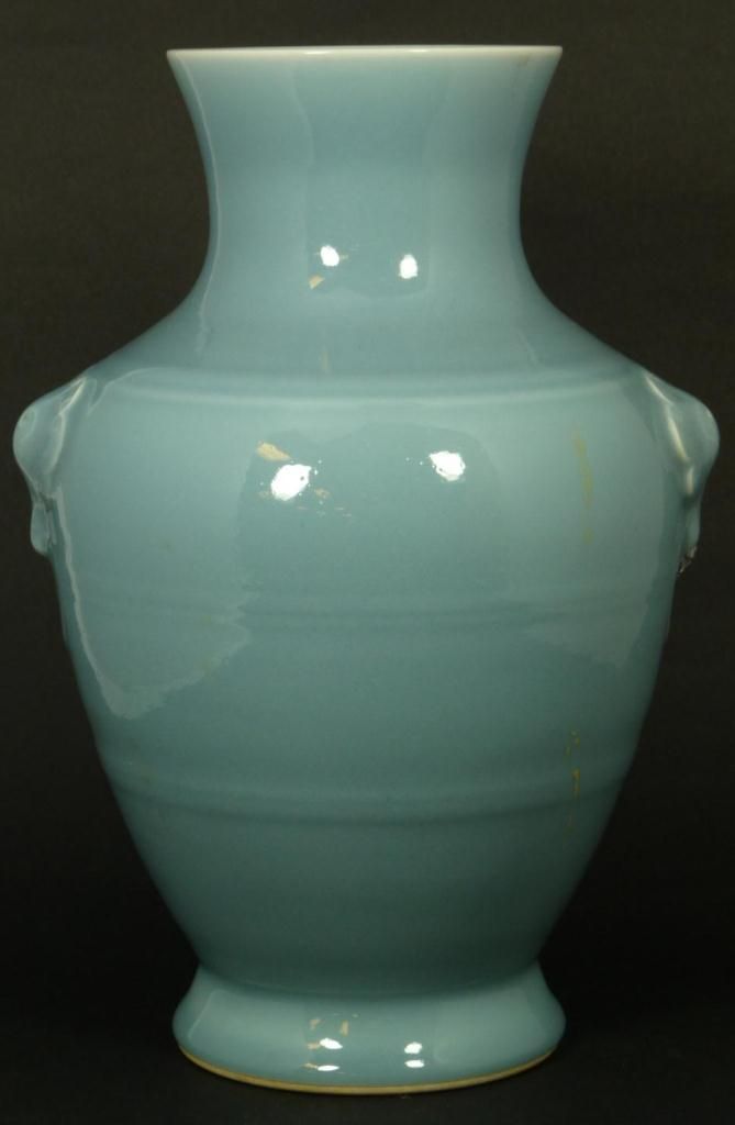 Antique Qing Dynasty period Chinese powder blue glazed vase. Having raised elephant handles with rings to sides. Bottom holds six character blue archaic Qianlong (1736-1795) reign mark, and is of the period. Measures 11" height x 8" height (27.9cm x 20.3cm). Total weight of 2000 grams.