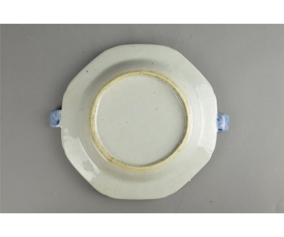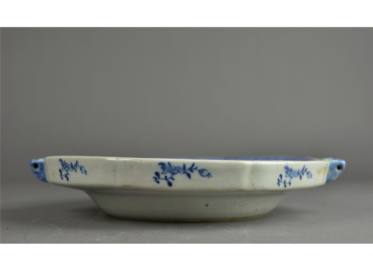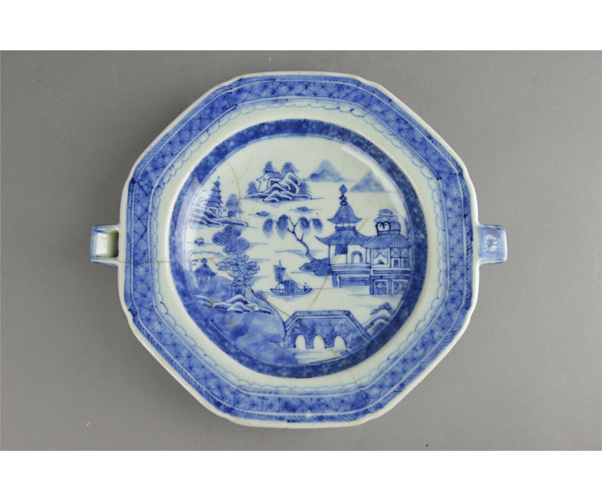 18th Century Chinese blue and white porcelain food warming plate; octagonal form featuring landscape scene with handles; L: 22 cm, H: 4.5 cm