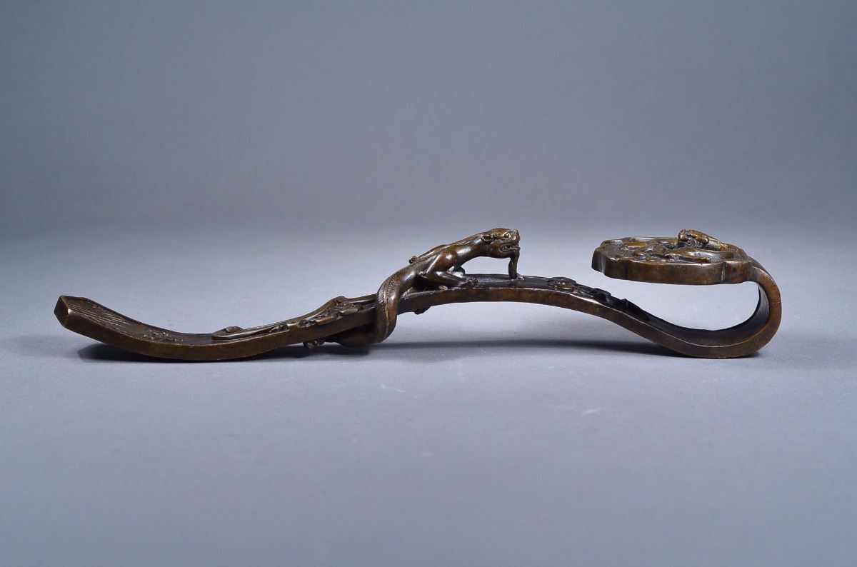 18th Century Chinese bronze ruyi scepter; the tail decorated with chevrons underneath a stylized pendant trefoil ruyi-head; the ruyi head featuring chilong amid stylized ruyi head cloud scrolls opposite facing a clambering chilong on shaft; four-character Qianlong Mark; L: 26 cm, 569 grams