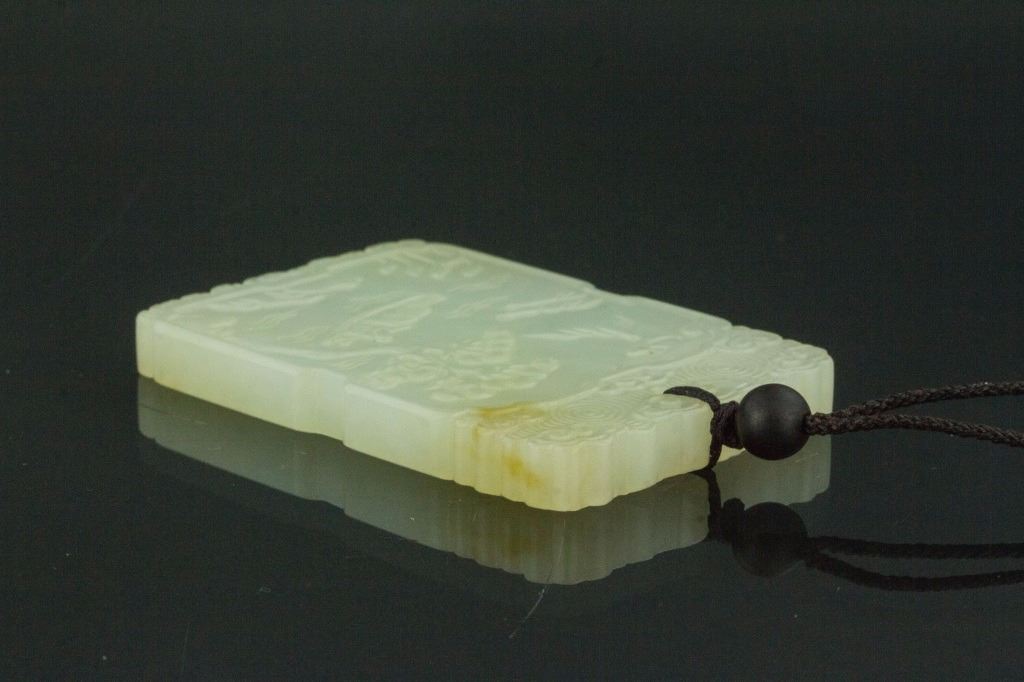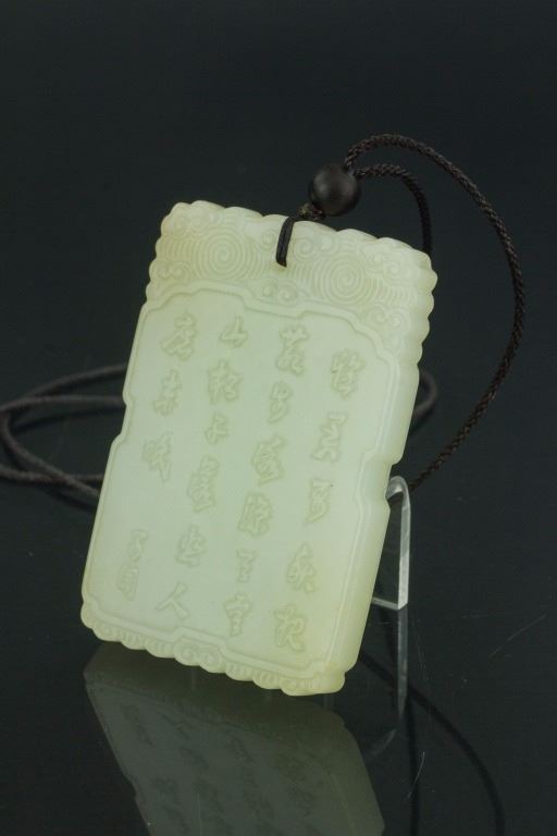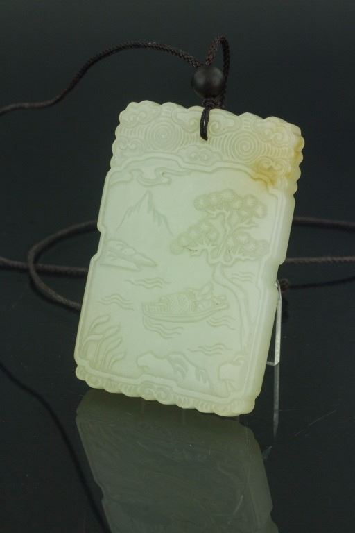Chinese Hetian white jade carved pendant; of rectangular shape wavy edge; with carved cloud pattern decoration on edge; front carved mountainous landscape with pine tree and boat; back carved Chinese character calligraphy; singed Zi Gang; pierced for suspension; 18th Century; Thickness: 0.7 cm, W: 4.8 cm, L: 7 cm, 67 grams, Density: 2.97