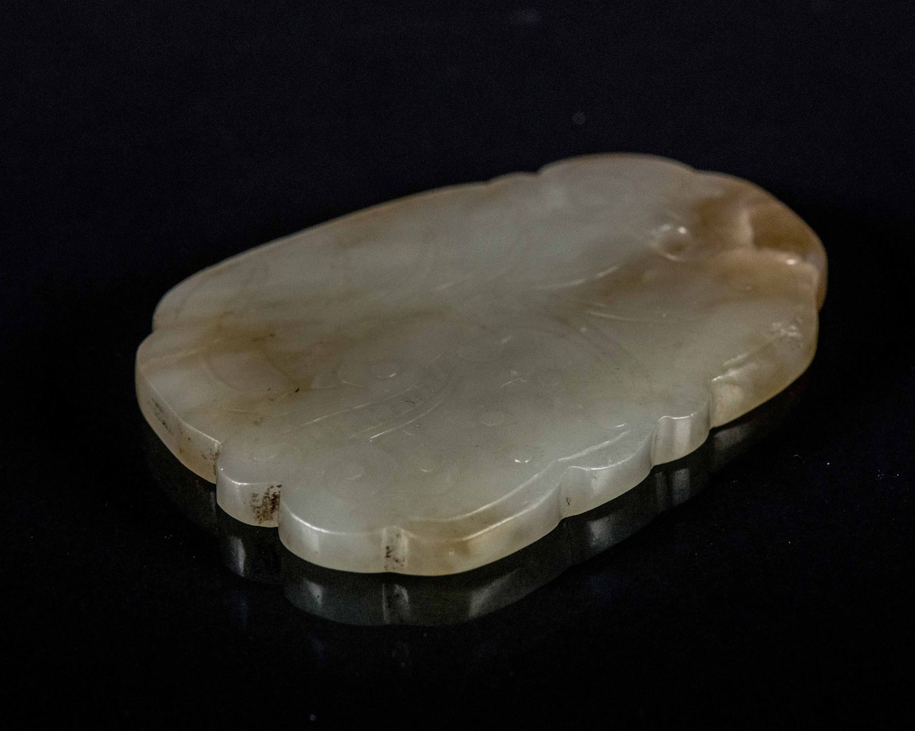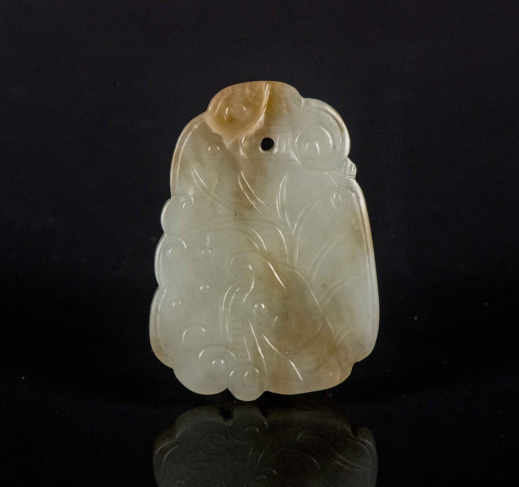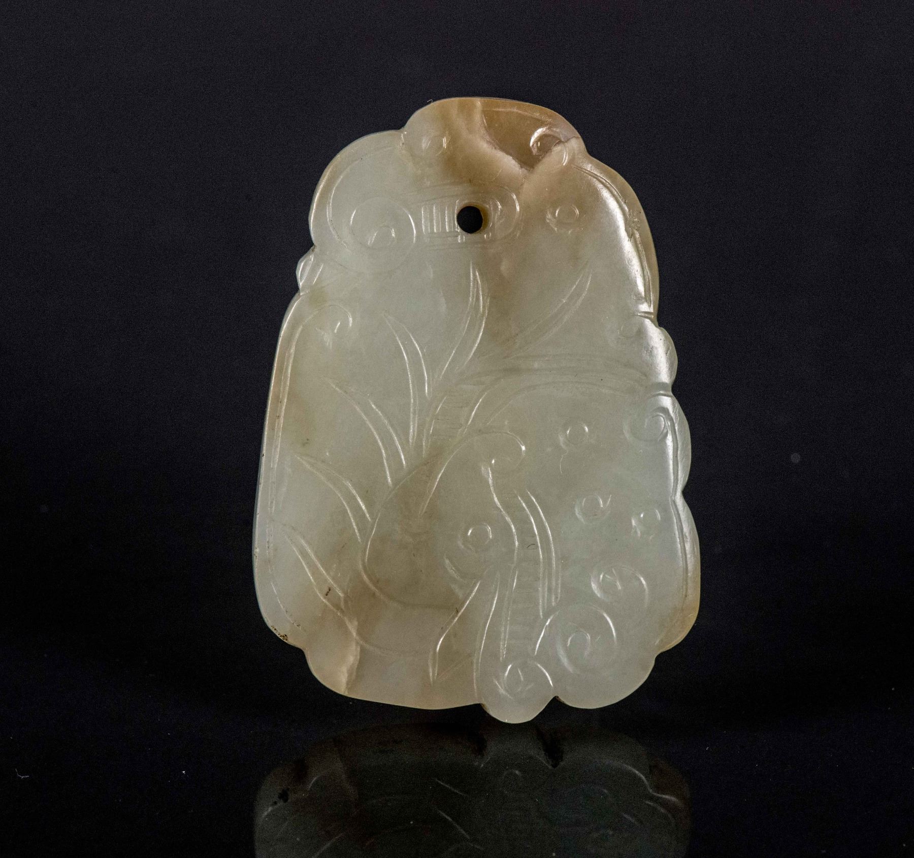 Chinese 18th century jade pendant; featuring carved flower patterns; of white tone with russet suffusions; pierced for suspension; H: 6.5 cm, W: 4.5 cm, 35 grams; Density: 2.96
